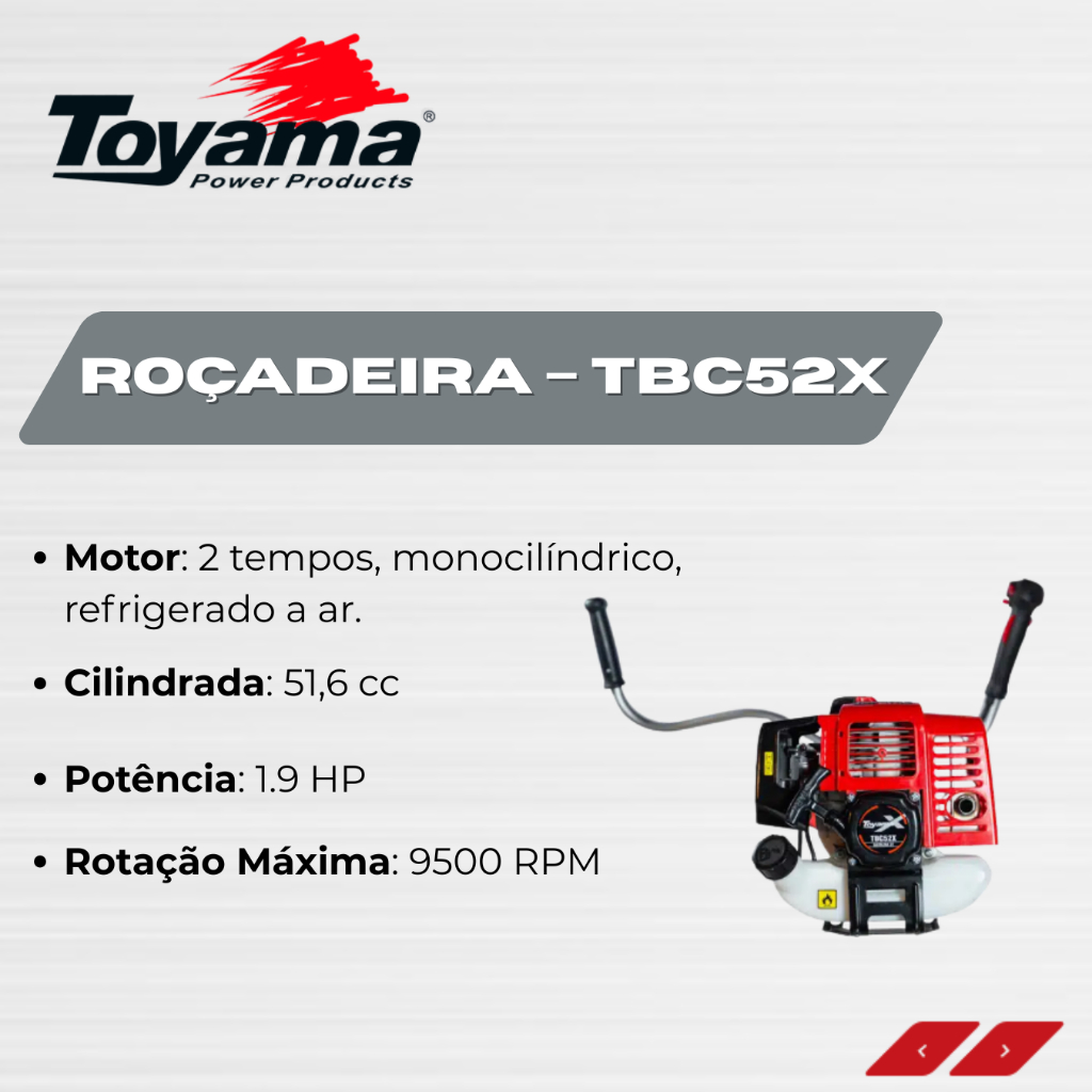 Roçadeira – TBC52X.....................................................................................................................................INFORMAÇÕES SOBRE O PRODUTO.....................................................................................................................................Roçadeira Lateral Toyama TBC52X, equipada com motor 2 tempos de 51,6 cilindradas. Da mesma família da TBC43X, porém com um novo e moderno visual. Detalhes de ergonomia, como sua manopla de aceleração, conforto de operação e ajuste do guidão dão a este equipamento o status de dentro da categoria de roçadeiras Toyama. Desenvolvida para um mercado onde o usuário necessita uma máquinas forte com um ótimo custo de aquisição. A Roçadeira TBC52X é equipada com acessórios de série: Colete Ergonômico, carretel de nylon......................................................................................................................................ESPECIFICAÇÕES DO PRODUTO.....................................................................................................................................Combustível:GasolinaTipo:LateralTipo de guidão:Guidão BicicletaRefrigeração:ArCilindros:MonocilíndricoTipo do Motor:2 TemposSistema de Partida:Manual RetrátilCilindrada:51.6 ccPotência Máxima:2.1 HPRotação Máxima:10000 RPMCapacidade do Tanque:1,1 lFiltro de Ar:Duplo ElementoCarretel de Nylon e Lâmina:Sim.....................................................................................................................................DÚVIDAS FREQUENTES.....................................................................................................................................Pergunta: Como é embalado o produto?Resposta: Todos os nossos produtos vendidos são embalados em caixas lacradas ou plástico stretch. Em respeito ao meio ambiente 90% das caixas são reutilizadas.Pergunta: Quem faz a entrega?Resposta: A entrega é terceirizada, feita via CORREIOS ou TRANSPORTADORA.Pergunta: O envio é feito em quantos dias?Resposta: Nós enviamos o seu pedido no prazo máximo de 24 horas após a confirmação de sua compra, sendo um dos envios mais rápidos da plataforma.Pergunta: Os produtos são novos ou usados?Resposta: Todos os produtos que trabalhamos são novos e com qualidade garantida......................................................................................................................................