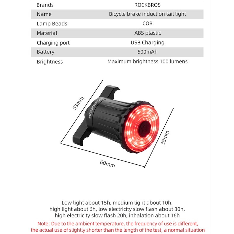Marca: ROCKBROS Nome do produto: Lanterna traseira do sensor de freio de bicicleta Número do artigo: 24520500001 Material do escudo: escudo de plástico ABS Cor da concha: preto Peso: cerca de 50g Porta de carregamento: USB Bateria: 500mAh Brilho: brilho máximo 100Lumens 7 modos: baixa bateria piscando lentamente, alta bateria piscando lentamente, piscando rápido, luz de respiração, luz baixa, luz média e luz alta. Ângulo de iluminação: 180° Cor da luz: vermelho Suporte: Suporte duplo (arco sentado, pólo sentado) Características: sensor de freio, sensor de luz inteligente (clique para modo automático, pressione e segure 3 para ligar o modo manual)