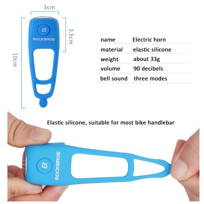 Nome: chifre elétrico Material: gel de sílica elástico Peso: 33g Volume: 90 decibéis Modelo: 3 modelos. Pressione 3 segundos para alterar o som Aplicável: bicicleta de estrada, bicicleta de montanha, bicicleta dobrável Modelo da bateria de botão: CR2032 Características: Pequeno e conveniente; Fácil de instalar; Resistente à água; Não mergulhe na água por muito tempo Baixo consumo de energia; A bateria pode durar um ano.