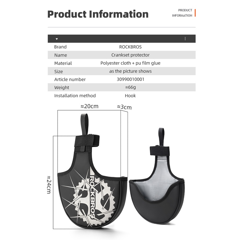 Marca:rockbros Nome:protetor de pedaleira Material: pano de poliéster + cola de filme pu Como a imagem mostra Número do artigo:30990010001 Peso: 66g Método de instalação:Gancho