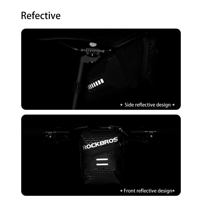 Detalhe do produto: Nome: saco de sela ROCKBROS Marca: ROCKBROS Tamanho: Cerca de 8,4*16,5*9,6*12,8mcm Peso: cerca de 120G Apto para: Bicicleta dobrável/MT Característica do recurso: Bolsa com o zíper impermeável Gancho refletivo e leve Mais seguro no design exterior patenteado à noite Mais encaixe para bicicleta portátil, à prova de choque