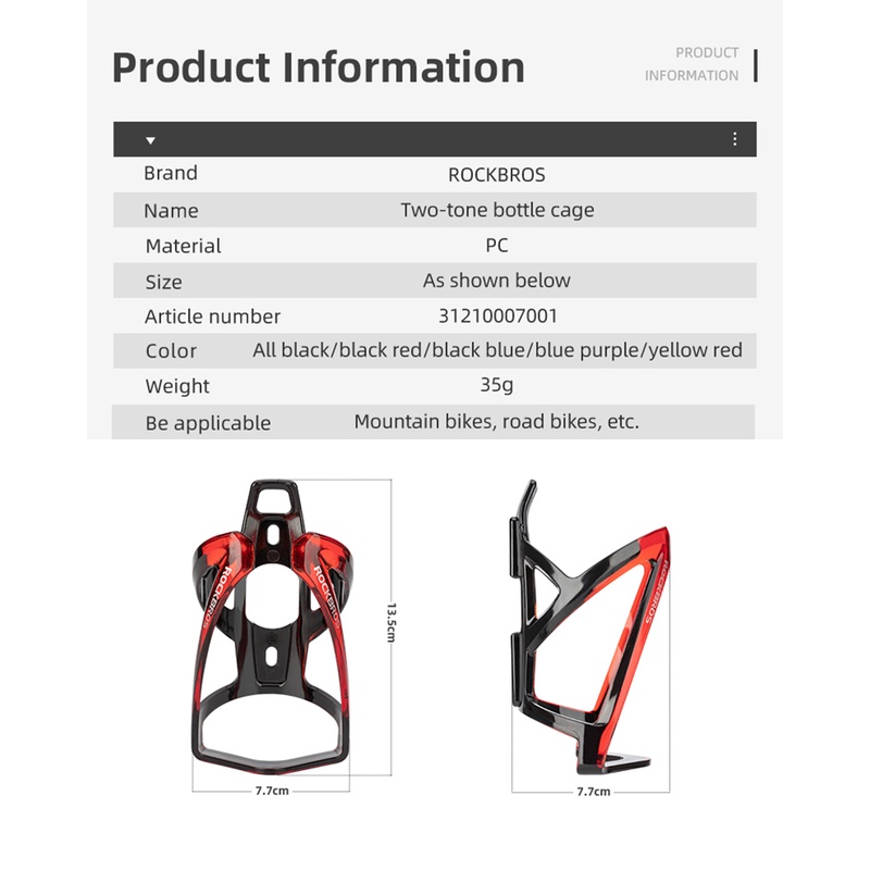 Marca: ROCKBROS Material: PC Tamanho: como mostrado abaixo Número do artigo:31210007001 Cor: todo preto/preto vermelho/preto azul/azul roxo/amarelo vermelho Peso: 35g Seja aplicável:Mountain bicicletas, bicicletas de estrada, etc. Características: 1.Instalação estável e fácil acesso 2.Não é fácil de raspar a chaleira 3.Leve e Boa tenacidade 4.A exposição ao sol ao ar livre não é fácil de desbotar, alto valor, mais durável 5.Use plástico PC - moldagem corporal die-casting, totalmente impermeável, resistente e resistente ao desgaste