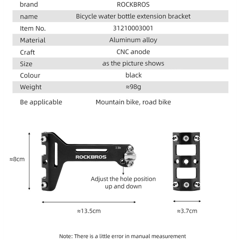 Marca:rockbros Nome: Suporte de extensão da garrafa de água do bicicleta Material: Liga de alumínio Artesanato: ânodo CNC Tamanho: como a imagem mostra Cor: Preto Peso: 98g Seja aplicável: bicicleta de montanha, bicicleta de estrada Características: 1.Design estendido. Saco de transporte, bomba, gaiola de garrafa e outros equipamentos 2.Leve, apenas 98g 3.Um suporte e duas chaleiras 4.Fácil de instalar e estável