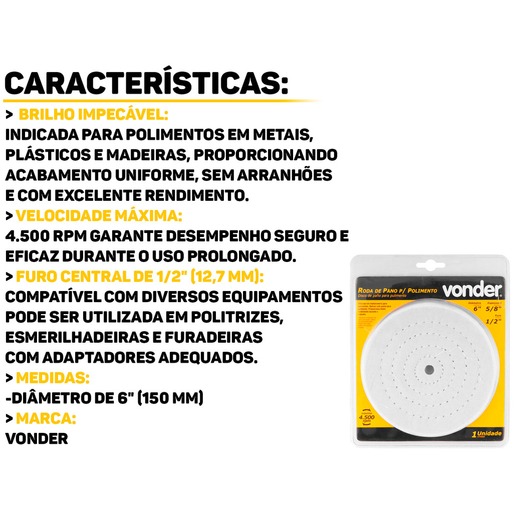 Roda de Pano para Polimento 6" Vonder A Roda de Pano Vonder é indispensável para quem busca um acabamento perfeito em seus trabalhos. Oferece um rendimento superior durante suas tarefas, garantindo um polimento eficiente e uniforme. É a escolha ideal para profissionais que buscam resultados rápidos e com alta qualidade. Características: > Proporciona maior rendimento durante o trabalho; > Utilizada em motoesmeris para polimentos. Aplicar com pasta para polimento; > Para obter os melhores resultados, recomenda-se a aplicação com pasta para polimento; > Com uma massa aproximada de 140g, esta roda de polimento é leve e fácil de manusear, tornando o trabalho menos cansativo. Especificações Técnicas: > Diâmetro: 150mm; > Diâmetro do furo: 12,7mm; > Rotação máxima: 4.500/min; > Peso aproximado: 140 gramas. - Marca: Vonder - Garantia: 90 dias contra defeitos de fabricação Vantagens de comprar na Brester: - Produto a pronta entrega. - Produto novo, com garantia de fábrica. - Nota fiscal para Pessoa Física e Pessoa Jurídica.