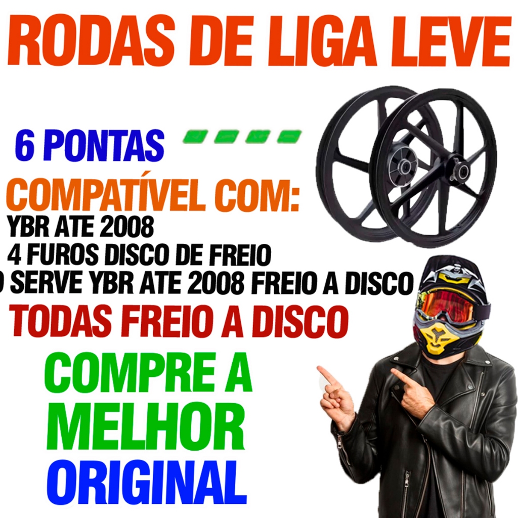 JOGO DE RODAS LIGA DE LEVE 6 PONTAS Smart Fox DA LOJA MEGA MOTOS COMPATÍVEL COM MOTOS COM FREIO A DISCO NA DIANTEIRA E LONA (TAMBOR) NA TRASEIRA dos MODELOS: YBR ATE 2008 FREIO A DISCO Se você não quer PERDER TEMPO lavando ARO, dando POLIMENTO COM BOMBRIL e depois ver sua roda toda ENFERRUJADA, então já PASSOU da HORA de colocar um RODÃO na sua MÁQUINA. E pode ter CERTEZA, você ACERTOU EM CHEIO na ESCOLHA! Pois as RODAS DE LIGA LEVE DA LOJA MEGA MOTOS são as MELHORES VENDIDAS no BRASIL! - ORIGINAIS DE FÁBRICA - ALUMINIO DE ALTÍSSIMA RESISTÊNCIA (para não amassar em qualquer buraco) - COM RETENTOR E ESPAÇADOR (VELOCIDADE, SEGURANÇA E MAIOR DURABILIDADE) ***** FIQUE ATENTO ANTES DE COMPRAR RODAS COMUNS, POIS ELAS NÃO VEM COM rolamentos e espaçadores da e retentor roda ******** Só as RODAS DE LIGA LEVE DA LOJA MEGA MOTOS vem COMPLETA COM ROLAMENTOS, ESPAÇADOR RODA, RETENTOR RODA Sendo que, com as RODAS DE LIGA LEVE DA LOJA MEGA MOTOS você apenas instala no pneu e pode rodar a vontade, elas vão COMPLETAS e na hora da LIMPEZA é SUPER FÁCIL e muito MAIS RÁPIDO! Além disso, você pode usar COM ou SEM CÂMERA de AR e você ainda GANHA DE BRINDE OS BICOS. Sua MOTO EQUIPADA, MAIS BONITA e como as MELHORES RODAS DO BRASIL! FICHA TÉCNICA: MARCA: Smart Fox COR: PRETO MATERIAL: ALUMINIO ITENS INCLUSOS: 1 - PAR DE RODAS LIGA LEVE 6 PONTAS Smart Fox DA LOJA MEGA MOTOS 2 - BICOS PARA DE RODAS LIGA LEVE 6 PONTAS DA LOJA MEGA MOTOS ENVIO IMEDIATO! Enviamos todos os PRODUTOS COM NOTA FISCAL e GARANTIA, além de todo SUPORTE e o melhor ATENDIMENTO que VOCÊ MERECE! Compre direto da nossa MEGAMOTOS, a MELHOR LOJA DE EQUIPAMENTES E ACESSÓRIOS para MOTOS do Brasil, desde 2007 atendendo com PRODUTOS DE QUALIDADE, ENTREGA RÁPIDA e os MELHORES PREÇOS.