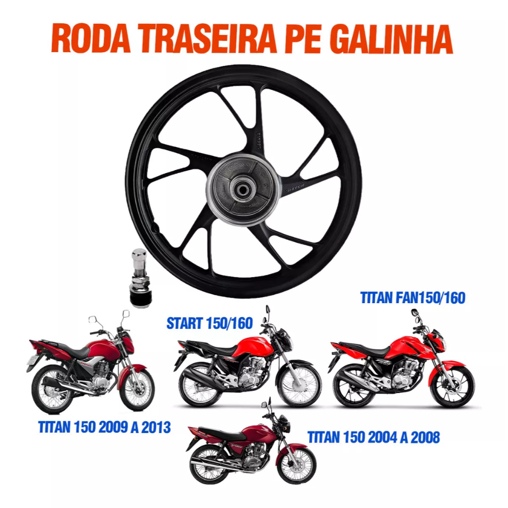 RODA TRASEIRA LIGA DE LEVE PE GALINHA Smart Fox DA LOJA MEGA MOTOS COMPATÍVEL COM MOTOS COM FREIO A TAMBOR (LONA) MODELOS: TITAN 150 2004 A 2008 TITAN E FAN 150 2009 A 2013 TITAN 150 2014 E 2015 START 150/160 TODAS TITAN 160 TODAS FAN 160 TODAS Se você não quer PERDER TEMPO lavando ARO, dando POLIMENTO COM BOMBRIL e depois ver sua roda toda ENFERRUJADA, então já PASSOU da HORA de colocar um RODÃO na sua MÁQUINA. E pode ter CERTEZA, você ACERTOU EM CHEIO na ESCOLHA! Pois as RODA DE LIGA LEVE SHIVER DA LOJA MEGA MOTOS são as MELHORES VENDIDAS no BRASIL! - ORIGINAIS DE FÁBRICA - ALUMINIO DE ALTÍSSIMA RESISTÊNCIA (para não amassar em qualquer buraco) - COM RETENTOR E ESPAÇADOR (VELOCIDADE, SEGURANÇA E MAIOR DURABILIDADE) ***** FIQUE ATENTO ANTES DE COMPRAR RODAS COMUNS, POIS ELAS NÃO VEM COM rolamentos e espaçadores da e retentor roda ******** Sendo que, com as RODAS DE LIGA LEVE DA LOJA MEGA MOTOS você apenas instala no pneu e pode rodar a vontade, elas vão COMPLETAS e na hora da LIMPEZA é SUPER FÁCIL e muito MAIS RÁPIDO! Além disso, você pode usar COM ou SEM CÂMERA de AR e você ainda GANHA DE BRINDE OS BICOS. Sua MOTO EQUIPADA, MAIS BONITA e como as MELHORES RODAS DO BRASIL! FICHA TÉCNICA: MARCA: Smart Fox COR: PRETO ITENS INCLUSOS: 1 - RODA TRASEIRA MODELO PE GALINHA TITAN E FAN E START 150/160 1- BICO SEM CAMARA ENVIO IMEDIATO! Enviamos todos os PRODUTOS COM NOTA FISCAL e GARANTIA, além de todo SUPORTE e o melhor ATENDIMENTO que VOCÊ MERECE! Compre direto da nossa MEGAMOTOS, a MELHOR LOJA DE EQUIPAMENTES E ACESSÓRIOS para MOTOS do Brasil, desde 2007 atendendo com PRODUTOS DE QUALIDADE, ENTREGA RÁPIDA e os MELHORES PREÇOS. Temos uma linha completa de RODAS, PNEUS, CAPECTES E ACESSÓRIOS para SUA MOTO, confira acessando: https://lista.mercadolivre.com.br/_CustId_500451242 AGORA CLIQUE em COMPRAR, ou se tiver alguma dúvida faça sua pergunta e RESPONDEREMOS RAPIDAMENTE : )