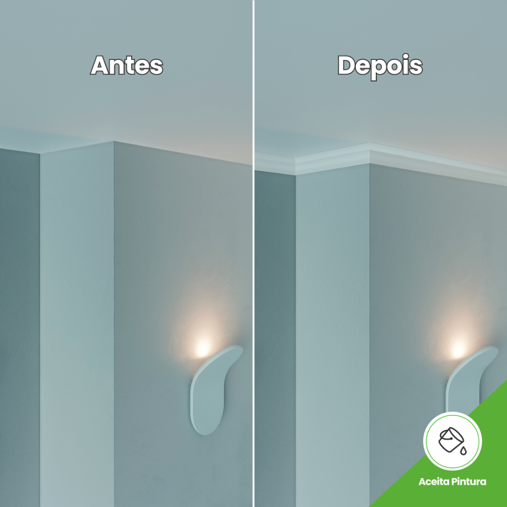 Faça você mesmo! Adquira o kit de instalação e tenha muito mais facilidade e praticidade na hora de instalar o seu produto: -Estilete -Gabarito de corte em 45° para quinas, cantos e molduras -Cola de contato para emendas Renove seu espaço com praticidade, estilo e qualidade que você vê e sente com Meu Rodapé. ------------------------------------------------------------------------------------------------------------------------------------------------------- Soluções autocolantes com qualidade, instalação rápida, fácil e sem sujeira. Tão fácil que você mesmo pode aplicar o produto (e nós te ajudamos a fazer isso!). Este modelo é ideal para dar maior acabamento ao seu ambiente, sendo instalado como roda teto. Ele também ajuda a disfarçar possíveis irregularidades na junção da parede com o teto, melhorando a sensação de finalização do seu cômodo. Como é enviado Somos uma fábrica e nosso material é produzido aqui mesmo, no Brasil. Utilizamos uma borracha sintética (EVA específico para a decoração) em nossa produção. Nosso produto é autocolante. Com o tempo desenvolvemos uma cola (fruto de inovação tecnológica), específica para a decoração. Ela garante maior fixação e durabilidade. Não utilizamos fita dupla-face. Diferente de outros materiais, o nosso é flexível e se adapta a paredes curvas com facilidade. Ele também é enviado em rolos (e é leve), o que facilita o seu recebimento e armazenamento. Do que o produto é feito?Nossos produtos são feitos em uma borracha sintética (EVA) específica para a decoração. O material possui alta resistência e flexibilidade, se adaptando a qualquer tipo de parede. Como é o processo de colagem?Não usamos fita dupla-face. Desenvolvemos uma cola específica para a decoração, mais forte e resistente, que garante a fixação do seu produto por anos e anos, sem dor de cabeça. A cola é protegida por uma película. Basta você retirar essa película e aplicar na sua parede. Como limpar? Não amarela? A limpeza pode ser feita com pano molhado e uma solução como detergente neutro ou saponáceo cremoso. Por ser um emborrachado resistente à água, você pode molhá-lo na hora da limpeza, sem problema. Fique tranquilo, ele não vai amarelar nem sofrer com cupins ou outras pragas. Tem outras cores? Posso pintar?A maior parte dos nossos produtos está disponível na cor branca (acabamento fosco). Alguns modelos possuem variação, sendo oferecidos na cor preta. Nos modelos brancos a pintura é recomendada, apesar de não ser obrigatória. Você pode pintar com tintas a base de água ou solvente (as mesmas que já utilizadas nas paredes). Posso instalar em áreas externas e banheiros? Não recomendamos a instalação em áreas molhadas, como dentro do box. Em áreas externas, banheiros e outras situações específicas pode ser necessário o reforço com cola de contato ou silicone. Como fazer os cortes das quinas? Com o nosso kit instalação (vendido separadamente) você realiza os cortes em 45º, facilitando o processo. Também temos vídeos de orientação para lhe ajudar ao longo da instalação. Como calcular a metragem que preciso? Como a venda ocorre por metro, basta você medir as paredes em que o produto será aplicado (usando uma trena ou fita métrica). Some todas as medidas. O resultado será o total, em metros, de roda tetos que você precisa. Lembre-se de adquirir sempre um pouquinho a mais para possíveis perdas na hora da instalação. A Meu Rodapé é uma empresa que tem a inovação na sua essência. Nós nascemos para mudar o rumo da decoração. Somos a Revolução na Decoração 💚 Utilizamos uma borracha sintética (EVA específico para a decoração) em nossa produção e desenvolvemos uma cola inovadora e exclusiva. Os produtos autocolantes são nossa especialidade. Garantimos a melhor qualidade e custo x benefícios do segmento. Com o tempo, desenvolvemos nossos produtos e alcançamos mais de 500 mil lares. Hoje somos a N°1 em Acabamentos Autocolantes 🥇