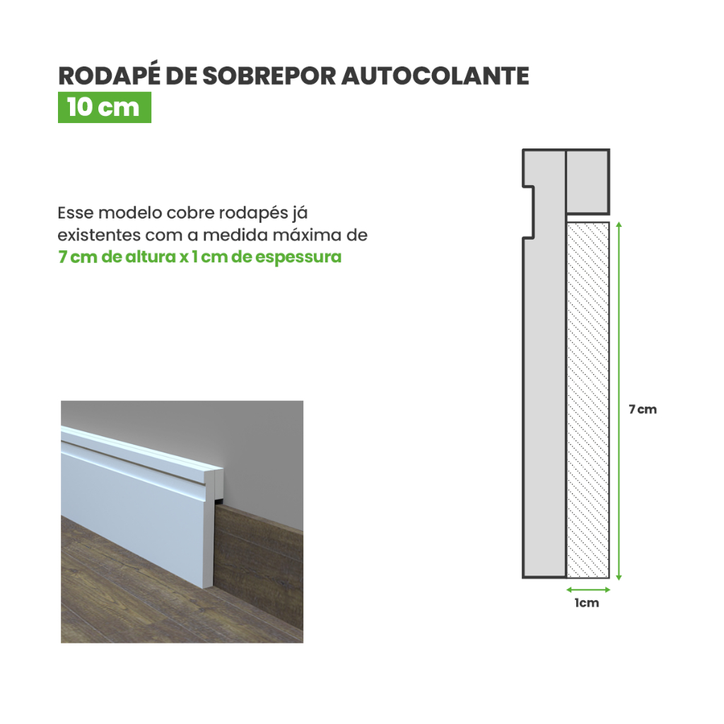Do que o produto é feito? Nossos produtos são feitos em uma borracha sintética (EVA) específica para a decoração. O material possui alta resistência e flexibilidade, se adaptando a qualquer tipo de parede. Como funciona a sobreposição? Este modelo vai se encaixar com perfeição sobre o rodapé que você já possui. Só fique atento à medida do seu rodapé atual. Ele não pode ter mais do que 1cm de espessura. Sobre a altura, oferecemos este produto em dois modelos. O modelo de 10cm cobre rodapés já existentes de 7x1cm. Já o modelo de 15cm cobre rodapés de 11x1cm. Como é o processo de colagem? Sua fixação também é muito fácil. Você só precisa fixar primeiramente o acabamento superior e, na sequência, o acabamento frontal. Tudo de forma autocolante. Não esqueça de utilizar silicone para uma melhor aderência do produto na parede/revestimento já existente, bem como para realizar a calafetação e acabamentos. Fique tranquilo, temos vídeos te ensinando todo o processo (e é muito mais simples do que parece!). Como limpar? Não amarela? A limpeza pode ser feita com pano molhado e uma solução como detergente neutro ou saponáceo cremoso. Por ser um emborrachado resistente à água, você pode molhá-lo na hora da limpeza, sem problema. Fique tranquilo, ele não vai amarelar nem sofrer com cupins ou outras pragas. Tem outras cores? Posso pintar? Neste modelo trabalhamos apenas com a cor branca (natural da matéria prima), com acabamento fosco. A pintura é recomendada, apesar de não ser obrigatória. Você pode pintar com tintas a base de água ou solvente (as mesmas que já utilizadas nas paredes). Posso instalar em áreas externas e banheiros? Não recomendamos a instalação em áreas molhadas, como dentro do box. Em áreas externas, banheiros e outras situações específicas pode ser necessário o reforço com cola de contato ou silicone. Como fazer os cortes das quinas? Com o nosso kit instalação (vendido separadamente) você realiza os cortes em 45º, facilitando o processo. Também temos vídeos de orientação para lhe ajudar ao longo da instalação. Como calcular a metragem que preciso? Como a venda ocorre por metro, basta você medir as paredes em que o produto será aplicado (usando uma trena ou fita métrica). Some todas as medidas. O resultado será o total, em metros, de rodapés que você precisa. Lembre-se de adquirir sempre um pouquinho a mais (em torno de 5 a 10%) para possíveis perdas na hora da instalação. Soluções autocolantes com qualidade, instalação rápida, fácil e sem sujeira. Tão fácil que você mesmo pode aplicar o produto (e nós te ajudamos a fazer isso!). Este modelo é ideal para cobrir rodapés já existentes (de cerâmica, madeira ou outros materiais). Atente-se às medidas do produto que você já possui instalado. Este modelo possui duas variações (10 e 15cm), que respectivamente cobrem rodapés já existentes com a medida máxima de 7cm de altura x 1cm de espessura ou de 11cm de altura x 1cm de espessura. O modelo de sobrepor é autocolante e sua instalação é rápida e fácil. Para garantir a perfeita aplicação, orientamos o uso de silicone branco no reforço da fixação. Como é enviado Somos uma fábrica e nosso material é produzido aqui mesmo, no Brasil. Utilizamos uma borracha sintética (EVA específico para a decoração) em nossa produção. Com o tempo desenvolvemos uma cola (fruto de inovação tecnológica), específica para a decoração. Ela garante maior fixação e durabilidade. Diferente de outros materiais, o nosso é flexível e se adapta a paredes curvas com facilidade. Ele também é enviado em rolos (e é leve), o que facilita o seu recebimento e armazenamento. Nossa venda ocorre por múltiplos de 2,5m. Basta colocar a metragem total desejada no ato da compra. Fique tranquila(o), que você não receberá vários rolos pequenos, caso compre uma grande quantidade. O modelo de sobrepor é autocolante e sua aplicação é rápida e fácil. A Meu Rodapé é uma empresa que tem a inovação na sua essência. Nós nascemos para mudar o rumo da decoração. Somos a Revolução na Decoração Utilizamos uma borracha sintética (EVA específico para a decoração) em nossa produção e desenvolvemos uma cola inovadora e exclusiva. Os produtos autocolantes são nossa especialidade. Garantimos a melhor qualidade e custo x benefícios do segmento. Com o tempo, desenvolvemos nossos produtos e alcançamos mais de 500 mil lares. Hoje somos a N°1 em Acabamentos Autocolantes