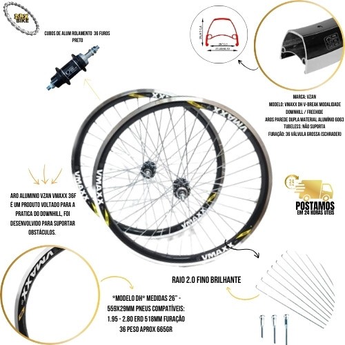 SERVE SO PARA APENAS FREIO V-BREAK - 1 PAR DE RODA Modalidade Downhill / Freeride Medidas 26x1.95 ( 559 ) Raio 2.0 Fino Brilhante Furação 36 Material Alumínio 6063 Válvula Grossa O KIT DE RODAS JÁ VAI MONTADO E ALINHADO PRONTO PARA O USO RAIOS POLIDOS