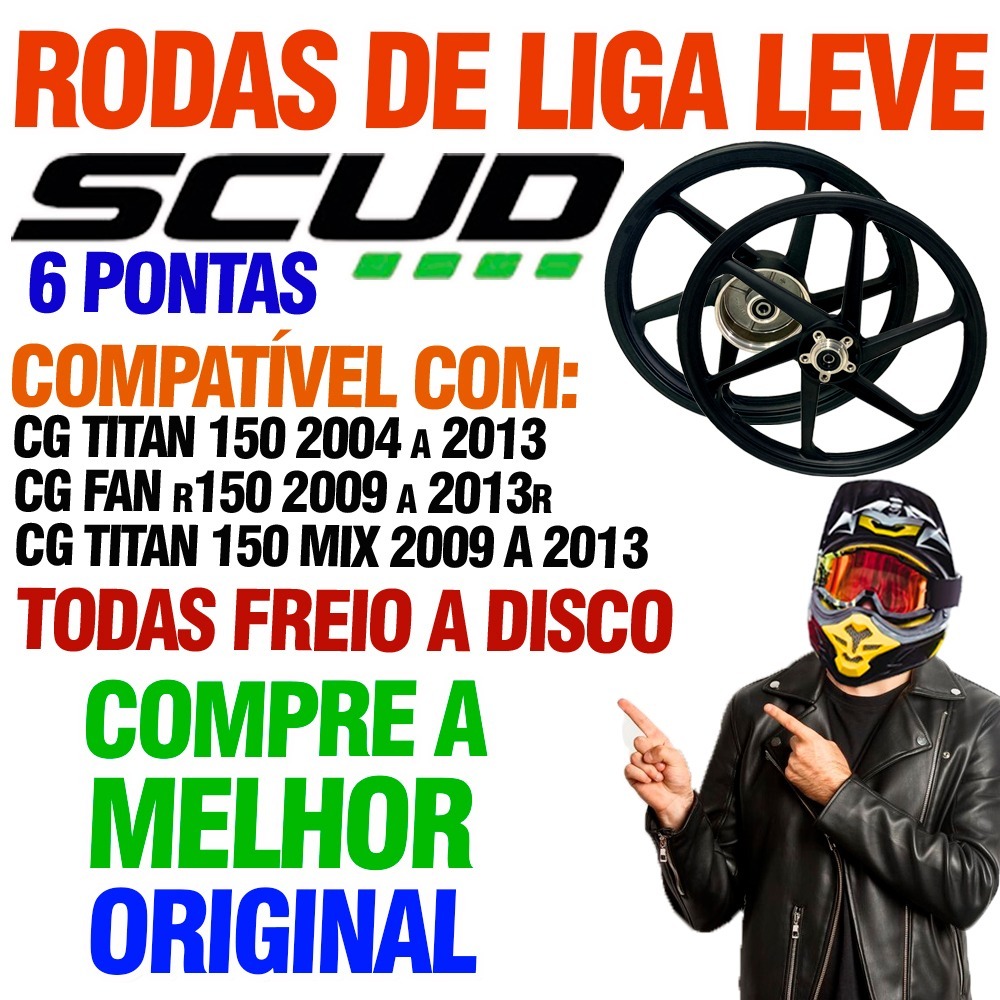 Trabalhamos com produtos a pronta entregas, vendas realizadas até às 14 horas serão despachadas no mesmo dia Caso tenha alguma dúvida, nós pergunte antes da compra será um prazer respondê-las RODA DE LIGA LEVE 6 PALITOS SCUD (PAR) - As rodas Scud são fabricadas com matéria prima nobre, construídas em sistema de injeção de alumínio de alta tecnologia, o que proporciona alem de muita leveza, um ótimo acabamento, altíssima qualidade e resistência; - Este jogo de roda já é fornecido com todos os rolamentos, espaçadores e retentores o que facilita a montagem; - Com exclusivo design Scud, e uma embalagem inédita, as rodas Scud chegaram para revolucionar o mercado. - Aplicação: TITAN 150 ESD até 2013 / FAN 150 ESDi 2010 até 2013; - Cor: Preta; - Marca: Scud. Marca: Scud; Cor: PRETO FOSCO; \\\Não Nos Responsabilizamos Pela Montagem Ou Instalação Do Produto. Sugerimos A Contratação Do Serviço Terceirizado De Montagem Ou De Algum Profissional Experiente De Sua Preferência. Imagem Meramente Ilustrativa.\\\ ========================================================================== Contém: 1 - Roda Dianteira com 2 rolamentos e 1 espaçador interno 1 - Roda Traseira com 2 rolamentos e 1 espaçador interno