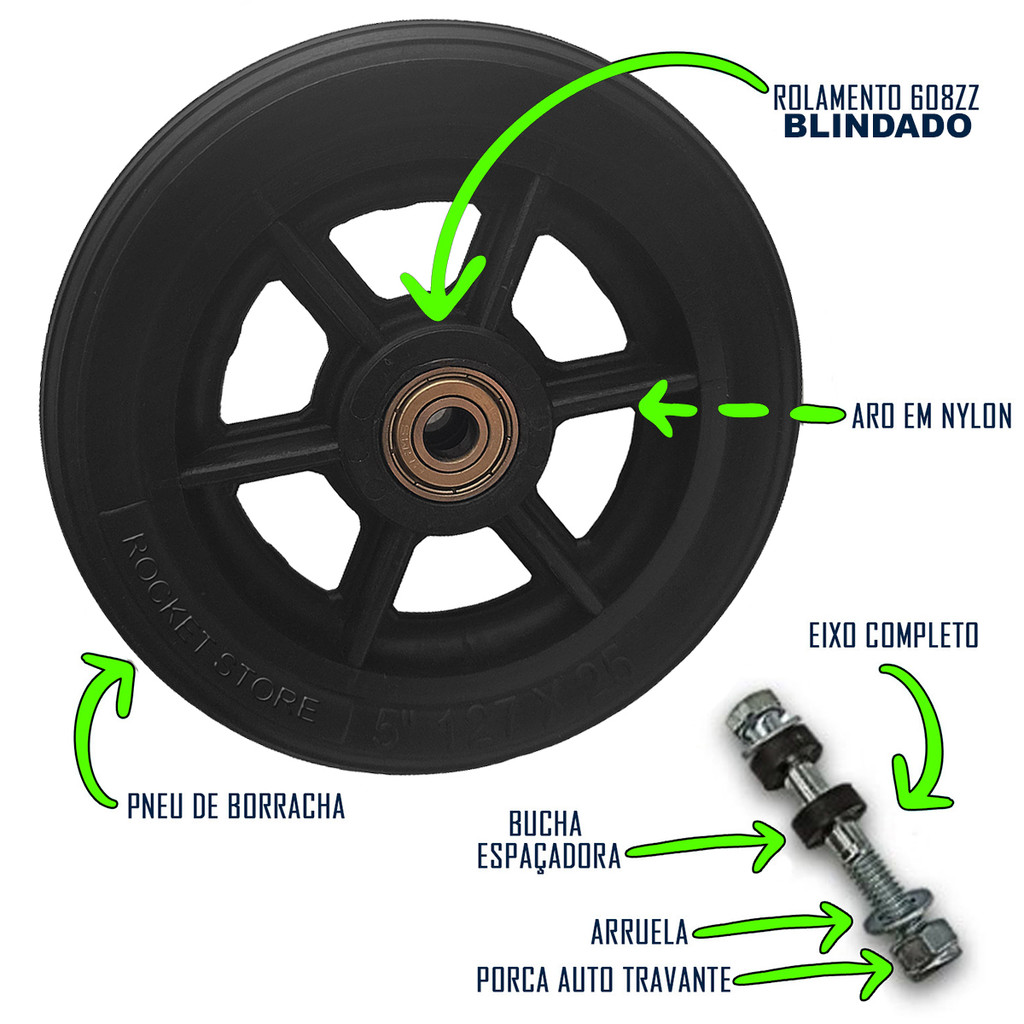 Conosco você possui as melhores condições de compras! * Envio em até 24hs. * Envio com segurança para que receba o seu produto em bom estado no conforto de sua casa. * Melhores condições de pagamento. * E o melhor de tudo, ofertas e promoções semanais! Produto: Par de Rodas Dianteira Aro 5 Preta Para Cadeira De Rodas - Aro em nylon - Pneu preto de borracha maciça - Acompanha rolamentos 608zz (já instalados) - Acompanha eixos! - Capacidade para até 120kg - Valor referente ao PAR! Medidas - Diâmetro: 12,5cm - Espessura do pneu: 2,5cm - Rolamento modelo 608zz com furação de 8mm --------------------------------------------------------------------------------------- Dúvidas Frequentes: --------------------------------------------------------------------------------------- 1. Por que comprar conosco? Porque somos a melhor empresa do Brasil e já atendemos milhares de clientes. 2. O produto é novo? Sim, o produto anunciado é novo, está em embalagem lacrada de fábrica. 3. O produto acompanha nota fiscal? Uma via da nota fiscal é enviada por e-mail, outra via está na etiqueta escrito DANFE junto ao produto, e tem mais uma via em DETALHES DA COMPRA no site. 4. Qual o tempo de garantia? A garantia é informada junto ao anúncio, em "GARANTIA". 5. Qual tempo de envio e formas de entrega? Os pedidos são despachados no mesmo dia da compra, desde que, liberados até às 14h. Compras efetuadas após este horário serão enviadas no próximo dia útil. O rastreamento estará disponível em detalhes de sua compra. O prazo de entrega é gerenciado pelo correios ou transportadora, de acordo com o CEP de entrega, logo, nós NÃO temos responsabilidade sobre possíveis atrasos. 6. Você ainda tem dúvidas? Nos envie uma pergunta sobre sua dúvida e nós responderemos com as informações necessárias. Somente clique em comprar após a plena certeza em honrar a compra e concordar com as condições descritas acima.