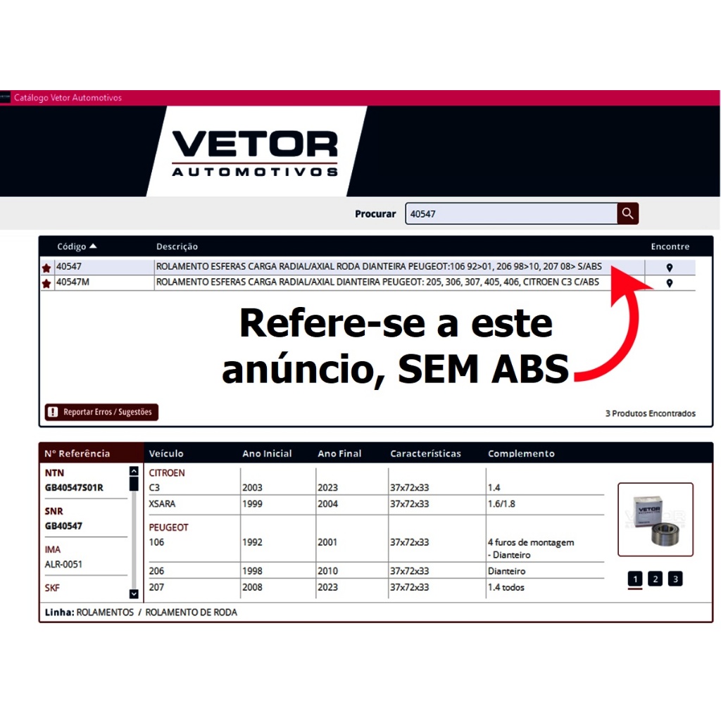ATENÇÃO ORIENTAMOS TER EM MÃOS O CÓDIGO OU AS MEDIDAS DO ROLAMENTO QUE ESTÁ NO CARRO, ISSO PORQUE O MESMO MODELO E ANO DE CARRO, PODE TER MAIS DE 1 TAMANHO DE ROLAMENTO TIRE TODAS AS DÚVIDAS ANTES DE EFETUAR A COMPRA! CONFIRME O VEÍCULO / ANO / MODELO DO CARRO ANTES DE REALIZAR A COMPRA. DESSA FORMA EVITAMOS O TRANSTORNO DE PEÇAS INCORRETAS / DEVOLUÇÕES. ------------------------------------------------ LINHA DO PRODUTO ROLAMENTO RODA DIANTEIRA ------------------------------------------------ CONTEÚDO: 01 (UM) ROLAMENTO ESFERAS CARGA RADIAL/AXIAL RODA DIANTEIRA PEUGEOT:106 92>01, 206 98>10, 207 08> S/ABS CÓDIGO: 40547 SEM ABS MEDIDAS: 37 x 72 x 33 MARCA: VETOR ------------------------------------------------ APLICAÇÕES: CITROËN - C3 1.4 - (37X72X33) - 2003, 2004, 2005, 2006, 2007, 2008, 2009, 2010, 2011, 2012, 2013, 2014, 2015, 2016, 2017, 2018, 2019, 2020, 2021, 2022, 2023, 2024 - XSARA 1.6/1.8 - (37X72X33) - 1999, 2000, 2001, 2002, 2003, 2004 PEUGEOT - 106 4 FUROS DE MONTAGEM - DIANTEIRO - (37X72X33) - 1992, 1993, 1994, 1995, 1996, 1997, 1998, 1999, 2000, 2001 - 206 DIANTEIRO - (37X72X33) - 1998, 1999, 2000, 2001, 2002, 2003, 2004, 2005, 2006, 2007, 2008, 2009, 2010 - 207 1.4 TODOS - (37X72X33) - 2008, 2009, 2010, 2011, 2012, 2013, 2014, 2015, 2016, 2017, 2018, 2019, 2020, 2021, 2022, 2023, 2024 ------------------------------------------------ CÓDIGOS EQUIVALENTES CITROEN - 335032 PEUGEOT - 335032 FAG - F-561166 FERSA - F16029 IMA - ALR-0051 IRB - IR18005 NTN/SNR - GB40547S01R / GB40547 SKF - VKBC20013 ZEN - 92013 ------------------------------------------------ - GARANTIA E/OU DEVOLUÇÃO: O PRODUTO É NOVO E COM GARANTIA TOTAL POR NOSSO FORNECEDOR. PARA ISSO GUARDE A NFE QUE EMITIREMOS COM OS DADOS DO USUÁRIO QUE EFETUOU A COMPRA. - NÃO FAZEMOS TROCAS, APENAS DEVOLUÇÕES, QUE SÓ SERÁ POSSÍVEL CASO A EMBALAGEM NÃO TENHA SIDO RASGADA E NEM A PEÇA DANIFICADA. - ESSA GARANTIA NÃO COBRE MAL USO. ------------------------------------------------ NÃO NOS RESPONSABILIZAMOS POR DEFEITOS OCORRIDOS POR MÁ INSTALAÇÃO DO PRODUTO. TODO O PRODUTO DEVE SER INSTALADO POR UM PROFISSIONAL QUALIFICADO. AS COMPRAS REALIZADAS EM NOME DE PESSOA JURÍDICA ESTÃO SUJEITAS À COBRANÇA DE ICMS, CONFORME PROTOCOLO ICMS 41, DE 4 DE ABRIL DE 2008. CASO VOCÊ TENHA DÚVIDAS SOBRE O PERCENTUAL A SER APLICADO, CONSULTE A CLÁUSULA SEGUNDA, §1° DO REFERIDO PROTOCOLO. FOTOS MERAMENTE ILUSTRATIVAS ------------------------------------------------ SOBRE A EMPRESA SOMOS UMA EMPRESA ESPECIALIZADA NA VENDA DE PEÇAS AUTOMOTIVAS, COM AMPLA EXPERIÊNCIA NO MERCADO E COMPROMISSO COM A SATISFAÇÃO DE NOSSOS CLIENTES. TRABALHAMOS APENAS COM PRODUTOS NOVOS, DE QUALIDADE E PROCEDÊNCIA GARANTIDA, OFERECENDO SEGURANÇA E CONFIABILIDADE EM CADA COMPRA. NOSSO OBJETIVO É PROPORCIONAR UM ATENDIMENTO ÁGIL, TRANSPARENTE E DE EXCELÊNCIA. EM CASO DE DÚVIDAS, ENTRE EM CONTATO COM A NOSSA EQUIPE — SERÁ UM PRAZER TE ATENDER!