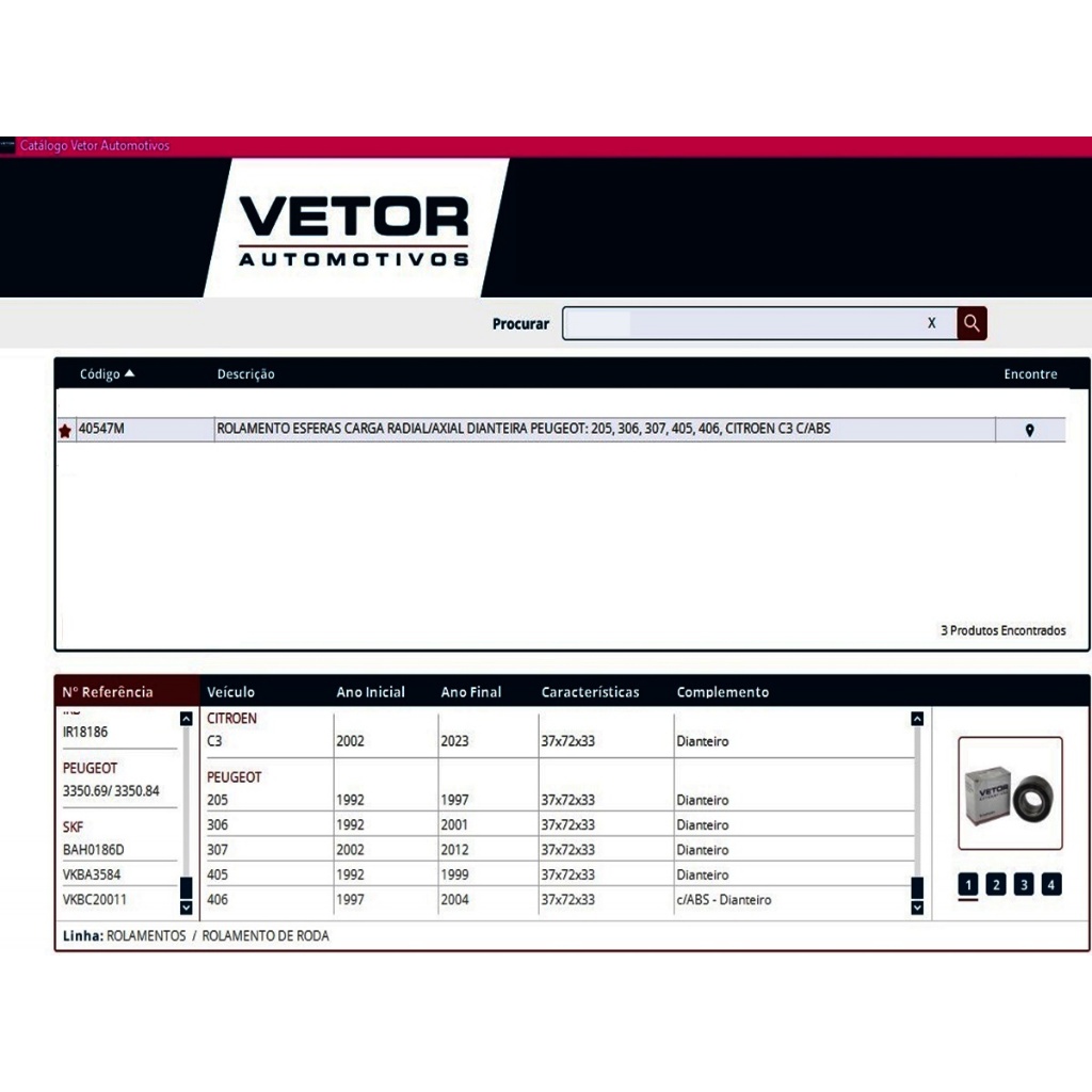 ATENÇÃO ORIENTAMOS TER EM MÃOS O CÓDIGO OU AS MEDIDAS DO ROLAMENTO QUE ESTÁ NO CARRO, ISSO PORQUE O MESMO MODELO E ANO DE CARRO, PODE TER MAIS DE 1 TAMANHO DE ROLAMENTO TIRE TODAS AS DÚVIDAS ANTES DE EFETUAR A COMPRA! CONFIRME O VEÍCULO / ANO / MODELO DO CARRO ANTES DE REALIZAR A COMPRA. DESSA FORMA EVITAMOS O TRANSTORNO DE PEÇAS INCORRETAS / DEVOLUÇÕES. _________________________________________ LINHA DE PRODUTO ROLAMENTO ROLAMENTO RODA DIANTEIRA _________________________________________ CONTEÚDO: 01 (UM) ROLAMENTO RODA DIANTEIRA CÓDIGO: 40547MVET MEDIDAS: 37X72X33 MARCA: VETOR _________________________________________ APLICAÇÕES: ***CITROËN*** - C3 DIANTEIRO - (37X72X33) - 2002, 2003, 2004, 2005, 2006, 2007, 2008, 2009, 2010, 2011, 2012, 2013, 2014, 2015, 2016, 2017, 2018, 2019, 2020, 2021, 2022, 2023, 2024, 2025 ***PEUGEOT*** - 205 DIANTEIRO - (37X72X33) - 1992, 1993, 1994, 1995, 1996, 1997 - 306 DIANTEIRO - (37X72X33) - 1992, 1993, 1994, 1995, 1996, 1997, 1998, 1999, 2000, 2001 - 307 DIANTEIRO - (37X72X33) - 2002, 2003, 2004, 2005, 2006, 2007, 2008, 2009, 2010, 2011, 2012 - 405 DIANTEIRO - (37X72X33) - 1992, 1993, 1994, 1995, 1996, 1997, 1998, 1999 - 406 C/ABS - DIANTEIRO - (37X72X33) - 1997, 1998, 1999, 2000, 2001, 2002, 2003, 2004 __________________________________________________________________ CÓDIGOS EQUIVALENTES ATENÇÃO ORIENTAMOS NOSSOS CLIENTES A TEREM EM MÃOS O CÓDIGO OU AS MEDIDAS DO ROLAMENTO QUE ESTÁ NO CARRO, ISSO PORQUE O MESMO MODELO E ANO DE CARRO PODE TER MAIS DE 1 TAMANHO DE ROLAMENTO TIRE TODAS AS DÚVIDAS ANTES DE EFETUAR A COMPRA! CONFIRME O VEÍCULO / ANO / MODELO DO CARRO NOS CAMPOS DE COMENTÁRIOS ANTES DE REALIZAR A COMPRA. DESSA FORMA EVITAMOS O TRANSTORNO DE PEÇAS INCORRETAS / DEVOLUÇÕES. _________________________________________ LINHA DE PRODUTO ROLAMENTO ROLAMENTO RODA DIANTEIRA _________________________________________ CONTEÚDO: 01 (UM) ROLAMENTO RODA DIANTEIRA CÓDIGO: 40547MVET MEDIDAS: 37X72X33 MARCA: VETOR _________________________________________ APLICAÇÕES: ***CITROËN*** - C3 DIANTEIRO - (37X72X33) - 2002, 2003, 2004, 2005, 2006, 2007, 2008, 2009, 2010, 2011, 2012, 2013, 2014, 2015, 2016, 2017, 2018, 2019, 2020, 2021, 2022, 2023, 2024, 2025 ***PEUGEOT*** - 205 DIANTEIRO - (37X72X33) - 1992, 1993, 1994, 1995, 1996, 1997 - 306 DIANTEIRO - (37X72X33) - 1992, 1993, 1994, 1995, 1996, 1997, 1998, 1999, 2000, 2001 - 307 DIANTEIRO - (37X72X33) - 2002, 2003, 2004, 2005, 2006, 2007, 2008, 2009, 2010, 2011, 2012 - 405 DIANTEIRO - (37X72X33) - 1992, 1993, 1994, 1995, 1996, 1997, 1998, 1999 - 406 C/ABS - DIANTEIRO - (37X72X33) - 1997, 1998, 1999, 2000, 2001, 2002, 2003, 2004 __________________________________________________________________ CÓDIGOS EQUIVALENTES PEUGEOT - 335072/ 335086 DAC - 37720033 FAG - F-561481 FERSA - F16048 IMA - ALR-0072 ABS IRB - IR18072 SKF - VKBC20031 __________________________________________________________________ GARANTIA E/OU DEVOLUÇÃO: O PRODUTO É NOVO E COM GARANTIA TOTAL POR NOSSO FORNECEDOR. PARA ISSO GUARDE A NFE QUE EMITIREM OS COM OS DADOS DO USUÁRIO QUE EFETUOU A COMPRA. AS TROCAS DE PEÇAS OU DEVOLUÇÃO DO DINHEIRO SÓ SERÃO POSSÍVEIS CASO A EMBALAGEM NÃO TENHA SIDO RASGADA E NEM A PEÇA DANIFICADA. ESSA GARANTIA NÃO COBRE MAL USO. _____________________________________________________________________________________ NÃO NOS RESPONSABILIZAMOS POR DEFEITOS OCORRIDOS POR MÁ INSTALAÇÃO DO PRODUTO. TODO O PRODUTO DEVE SER INSTALADO POR UM PROFISSIONAL QUALIFICADO. AS COMPRAS REALIZADAS EM NOME DE PESSOA JURÍDICA ESTÃO SUJEITAS À COBRANÇA DE ICMS, CONFORME PROTOCOLO ICMS 41, DE 4 DE ABRIL DE 2008. CASO VOCÊ TENHA DÚVIDAS SOBRE O PERCENTUAL A SER APLICADO, CONSULTE A CLÁUSULA SEGUNDA, §1° DO REFERIDO PROTOCOLO. FOTOS MERAMENTE ILUSTRATIVAS _____________________________________________________________________________________ SOBRE A EMPRESA SOMOS UMA EMPRESA ESPECIALIZADA NA VENDA DE PEÇAS AUTOMOTIVAS, COM AMPLA EXPERIÊNCIA NO MERCADO E COMPROMISSO COM A SATISFAÇÃO DE NOSSOS CLIENTES. TRABALHAMOS APENAS COM PRODUTOS NOVOS, DE QUALIDADE E PROCEDÊNCIA GARANTIDA, OFERECENDO SEGURANÇA E CONFIABILIDADE EM CADA COMPRA. NOSSO OBJETIVO É PROPORCIONAR UM ATENDIMENTO ÁGIL, TRANSPARENTE E DE EXCELÊNCIA. EM CASO DE DÚVIDAS, ENTRE EM CONTATO COM A NOSSA EQUIPE — SERÁ UM PRAZER TE ATENDER! __________________________________________________________________