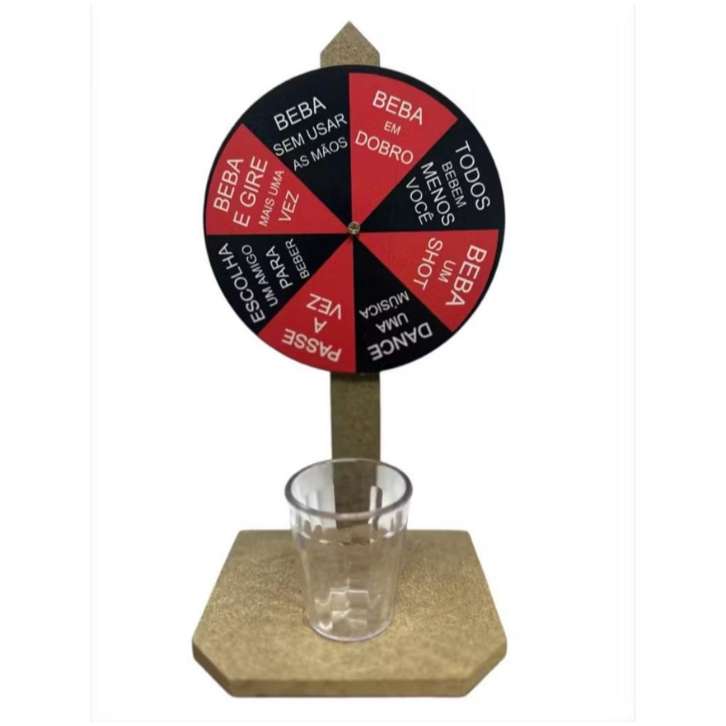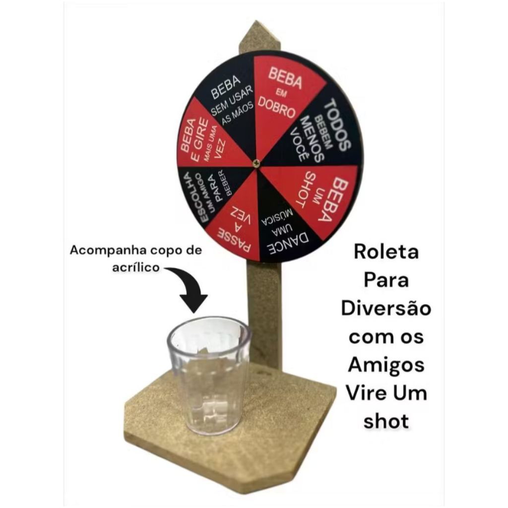 Composição: madeira de pinus, adesivo, mdf e copo aperitivo de acrílico Divirta-se nas festas e jogue com seus amigos - Instruções: Cada jogador deve girar a roleta no sentido horário. Basta encher o shot com tequila ou com a bebida que desejar e tentar a sorte girando a roleta. Comece e termine a noite com esse jogo super divertido. acompanha copo acrílico fábricação própria tamanho 23cmx12cm