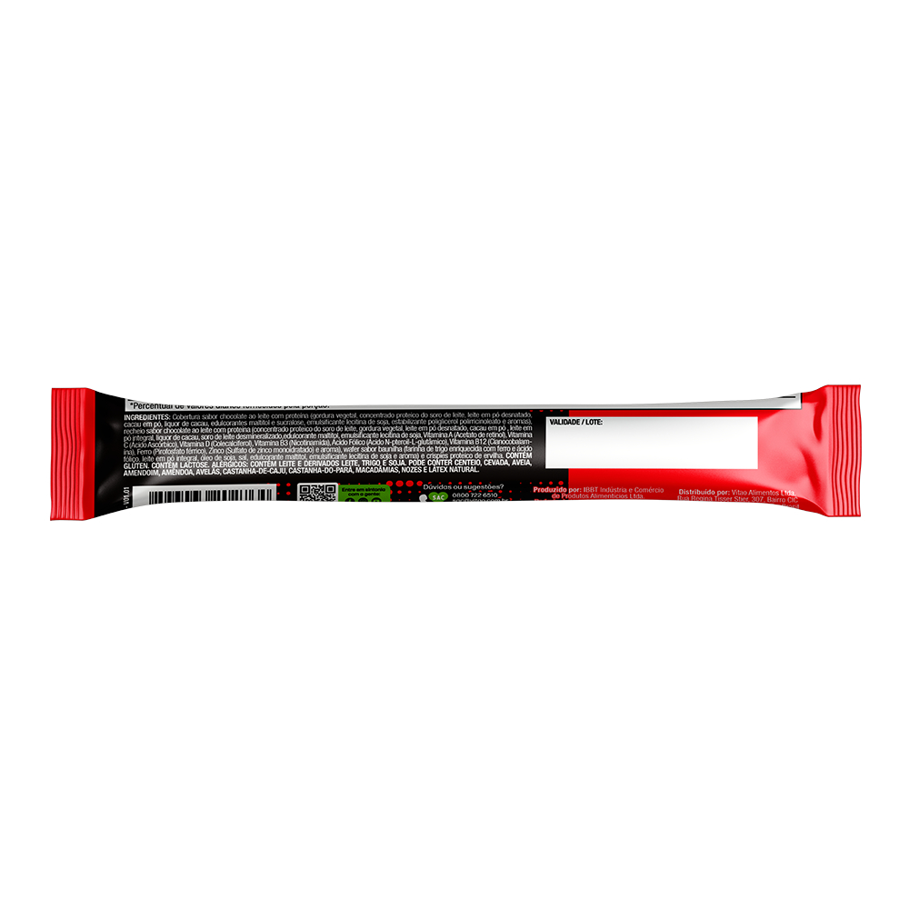 O rolinho wafer chocolate ao leite Choconerd zero açúcar, é uma opção deliciosa e saudável, feito com ingredientes de alta qualidade. Além de proporcionar o sabor irresistível do chocolate ao leite, destaca-se por ter 6,3 g de proteína por porção e ser também fonte de vitaminas. Essa escolha nutritiva e sem açúcares é perfeita para quem busca um doce saboroso e ao mesmo tempo saudável. INGREDIENTES: Cobertura sabor chocolate ao leite com proteína (gordura vegetal, concentrado proteico do soro de leite, leite em pó desnatado, cacau em pó, liquor de cacau, edulcorantes maltitol e sucralose, emulsificante lecitina de soja, estabilizante poliglicerol polirricinoleato e aromas), recheio sabor chocolate ao leite com proteína (concentrado proteico do soro de leite, gordura vegetal, leite em pó desnatado, cacau em pó , leite em pó integral, liquor de cacau, soro de leite desmineralizado,edulcorante maltitol, emulsificante lecitina de soja, Vitamina A (Acetato de retinol), Vitamina C (Ácido Ascórbico), Vitamina D (Colecalciferol), Vitamina B3 (Nicotinamida), Ácido Fólico (Ácido N-pteroil-L-glutâmico), Vitamina B12 (Cianocobalamina), Ferro (Pirofosfato férrico), Zinco (Sulfato de zinco monoidratado) e aroma), wafer sabor baunilha (farinha de trigo enriquecida com ferro e ácido fólico, leite em pó integral, óleo de soja, sal, edulcorante maltitol, emulsificante lecitina de soja e aroma) e crispies proteico de ervilha. ALÉRGICOS: CONTÉM LEITE E DERIVADOS LEITE, TRIGO E SOJA. PODE CONTER CENTEIO, CEVADA, AVEIA, AMENDOIM, AMÊNDOA, AVELÃS, CASTANHA-DE-CAJU, CASTANHA-DO-PARÁ, MACADÂMIAS, NOZES E LÁTEX NATURAL. CONTÉM GLÚTEN. CONTÉM LACTOSE. ZERO ADIÇÃO DE AÇÚCARES, PROTEICO, FONTE DE VITAMINAS.