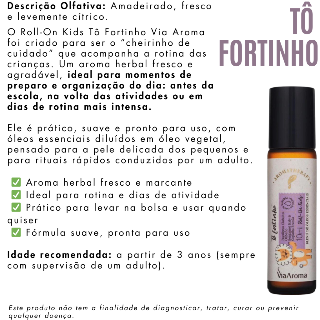 ROLL-ON BLEND DE ÓLEOS ESSENCIAIS INFANTIL KIDS VIA AROMA – 10ML Os Roll-Ons Kids Via Aroma foram desenvolvidos especialmente para o público infantil, com óleos essenciais cuidadosamente diluídos em óleo vegetal, oferecendo uma experiência aromática suave e adequada à pele delicada das crianças. Com composição pensada para o uso diário, os roll-ons infantis são práticos, fáceis de aplicar e ideais para integrar rituais de cuidado, carinho e conexão no dia a dia da família. PRINCIPAIS CARACTERÍSTICAS - Composição vegana - Não testado em animais - 100% diluído em óleo vegetal - Pronto para uso - Textura leve e aplicação prática 🎠 COMO USAR Aplique o roll-on exclusivamente sobre a pele, em áreas externas do corpo, sempre com supervisão de um adulto. Massageie suavemente com a ponta esférica metálica até a absorção. Para crianças com maior sensibilidade olfativa, a aplicação nas solas dos pés pode ser uma alternativa mais discreta, já que o aroma tende a ficar mais suave. O uso pode fazer parte de rituais de cuidado, como momentos de pausa, rotina noturna ou preparação para atividades do dia. 🎠 IDADE RECOMENDADA A linha Kids Via Aroma oferece opções pensadas para diferentes fases da infância. A recomendação de uso por idade é: - Calminha Aí e Lavanda: indicados para todas as idades - Hora do Soninho: a partir de 1 ano - Ei, Atenção, Respira Bem e Tô Fortinho: a partir de 3 anos ⚠️ Sempre aplicar com supervisão de um adulto. Em caso de dúvidas, consulte o pediatra. ⚠️ Este produto não tem a finalidade de diagnosticar, tratar, curar ou prevenir qualquer doença.