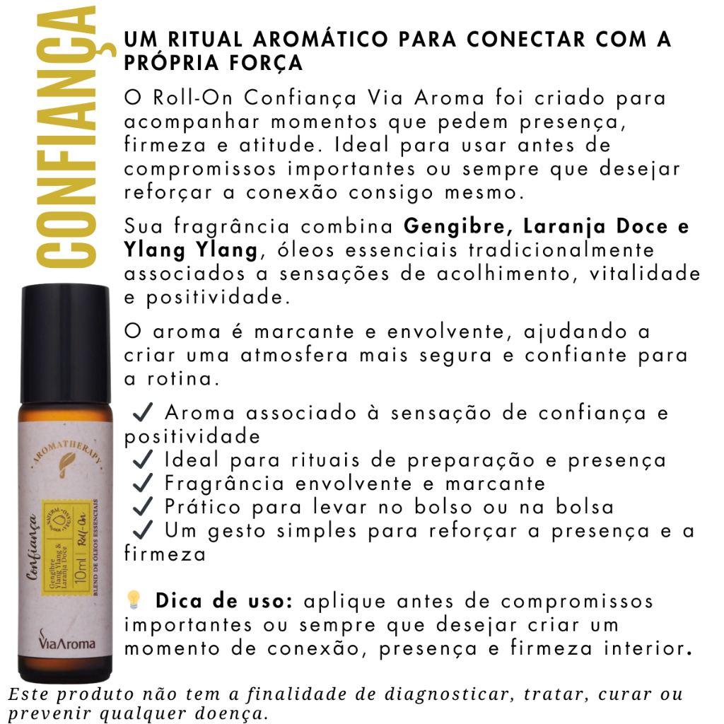 ROLL-ON BLEND DE ÓLEOS ESSENCIAIS VIA AROMA – 10ML Os roll-ons de óleos essenciais Via Aroma foram desenvolvidos para quem busca praticidade e uma experiência aromática agradável no dia a dia. Cada unidade é cuidadosamente formulada, com óleos essenciais diluídos em óleo vegetal, prontos para uso direto na pele. Compactos e fáceis de aplicar, são ideais para acompanhar diferentes momentos da rotina, em casa, no trabalho ou fora dele, fazendo parte de rituais pessoais de autocuidado e bem-estar. ✔ DIFERENCIAIS DO PRODUTO - Composição vegana - Não testado em animais - 100% diluído em óleo vegetal - Pronto para uso - Aplicação prática com esfera metálica - Embalagem compacta, ideal para levar na bolsa ou mochila 🌿 COMO USAR - Aplique o roll-on diretamente nas áreas desejadas do corpo ou rosto. - Massageie suavemente com a ponta esférica metálica até completa absorção. - Pode ser utilizado diariamente, sempre que desejar desfrutar da experiência aromática. 🌿 VARIAÇÕES DISPONÍVEIS - Este anúncio possui diferentes variações de aromas e blends de óleos essenciais. - Selecione a opção desejada no momento da compra. ⚠️ AVISO LEGAL Este produto não tem a finalidade de diagnosticar, tratar, curar ou prevenir qualquer doença.