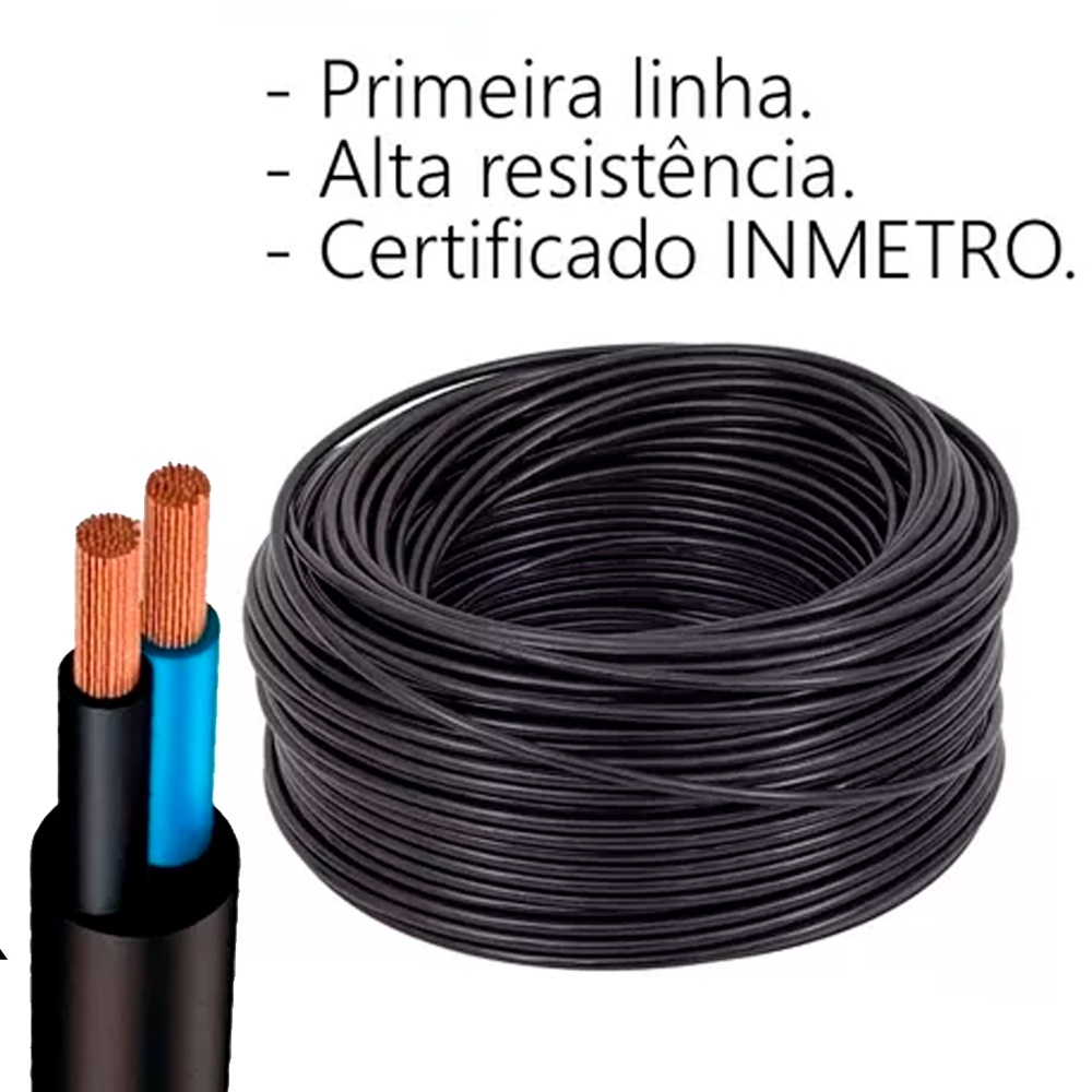 COMERCIAL VIPASA DISTRIBUIDORA. Rolo Cabo 2P Ou 3P Flexível Energia Extensão Para Máquinas Residência Fio Elétrico Alta Qualidade Rolo Cabo 2P - 3P Flexível Energia Extensão Máquina Residência Industria Fio Elétrico Alta Qualidade ESCOLHER NAS VARIAÇÕES O PRODUTO DESEJADO. CABO FLEXÍVEL PP PRETO 500V - ROLO COM 100 METROS - ENGECABOS / MEGATRON VARIAÇÕES DISPONÍVEIS: 2 ou 3 Vias | Bitolas: 1,00 mm², 1,50 mm² e 2,50 mm² Os Cabos Flexíveis PP 500V são ideais para instalações elétricas que exigem flexibilidade, resistência e segurança. Fabricados com condutores de cobre eletrolítico flexível e isolação dupla em PVC, esses cabos são indicados para uso em aparelhos portáteis, ferramentas elétricas, equipamentos industriais, extensões, motores e conexões em geral, inclusive em ambientes com movimentação constante. Todos os modelos possuem revestimento externo na cor preta, garantindo maior discrição, proteção contra abrasão e boa resistência a intempéries. Cada cabo possui duas ou três vias (condutores), com bitolas variadas de acordo com a aplicação. CARACTERÍSTICAS GERAIS Produto: Cabo Flexível PP 500V Aplicação: Extensões elétricas, motores, equipamentos industriais, ferramentas, eletrodomésticos, etc. Condutor: Cobre eletrolítico flexível Isolamento: Duplo em PVC (Policloreto de Vinila) Revestimento externo: PVC preto, resistente e flexível Tensão nominal: 500V Temperatura máxima de operação: 70°C Bobina com 100 metros Alta resistência mecânica e à abrasão Fácil manuseio e instalação MODELOS DISPONÍVEIS - VARIAÇÕES CARACTERÍSTICAS Os Cabos Flexíveis PP 500V são produzidos com condutores de cobre eletrolítico flexível e revestidos com dupla camada de PVC (isolação e cobertura). Seu revestimento externo é preto, resistente à abrasão e ao manuseio frequente. São cabos altamente flexíveis, indicados para instalações elétricas que exigem movimentação constante ou resistência mecânica superior. Disponíveis com 2 ou 3 vias internas, em bitolas de 1,00 mm², 1,50 mm² e 2,50 mm², fornecidos em bobinas de 100 metros. USO São indicados para uma ampla gama de aplicações elétricas tanto residenciais quanto industriais. Podem ser utilizados em: Extensões elétricas Instalações de ferramentas elétricas Equipamentos portáteis e industriais Motores, bombas e eletrodomésticos Sistemas onde há movimentação constante dos cabos, como máquinas de lavar, compressores, entre outros Além disso, são ideais para ambientes internos ou externos, graças à resistência do seu revestimento de PVC. COMO FUNCIONA Cada cabo é composto por condutores internos de cobre flexível (2 ou 3 vias), revestidos individualmente por PVC isolante. Esses condutores são, por sua vez, encapsulados em uma capa externa de PVC preto, que proporciona proteção contra desgaste mecânico e facilita o manuseio. A tensão nominal suportada é de 500 volts, com operação segura em temperaturas de até 70°C. A isolação dupla evita curtos e interfere na proteção contra choques e falhas elétricas. SOLUÇÕES ATENDIDAS Os Cabos PP 500V são a solução ideal para quem busca: Confiabilidade em instalações elétricas portáteis ou permanentes Durabilidade e resistência mecânica Flexibilidade para instalações móveis Alternativa segura para máquinas, extensões, ferramentas e equipamentos diversos Padronização e organização em projetos elétricos, com variedade de bitolas e vias para diferentes necessidades de corrente e potência DIMENSÕES E PESO MÉDIO POR MODELO (APROXIMADO): (Valores aproximados, podendo variar por fabricante) cabo pp 500v 2 vias 3 vias engecabos megatron rolo 100 metros flexivel revestido cobre pvc cabo flexivel preto eletrica extensao maquina ferramenta motor industrial bitola 1mm 1 5mm 2 5mm Cabo PP Flexível Preto 500V 2 ou 3 Vias 100m Engecabos ou Megatron Cabo PP Engecabos 500V Preto Flexível Bobina 100 Metros 2x1,0 2x1,5 2x2,5 3x1,0 3x1,5 3x2,5 Cabo Elétrico PP 2 ou 3 Vias Bitolas Variadas 100m Flexível Preto Cabo Flexível Revestido PP 500V Preto Bobina 100m Uso Geral COMERCIAL VIPASA DISTRIBUIDORA