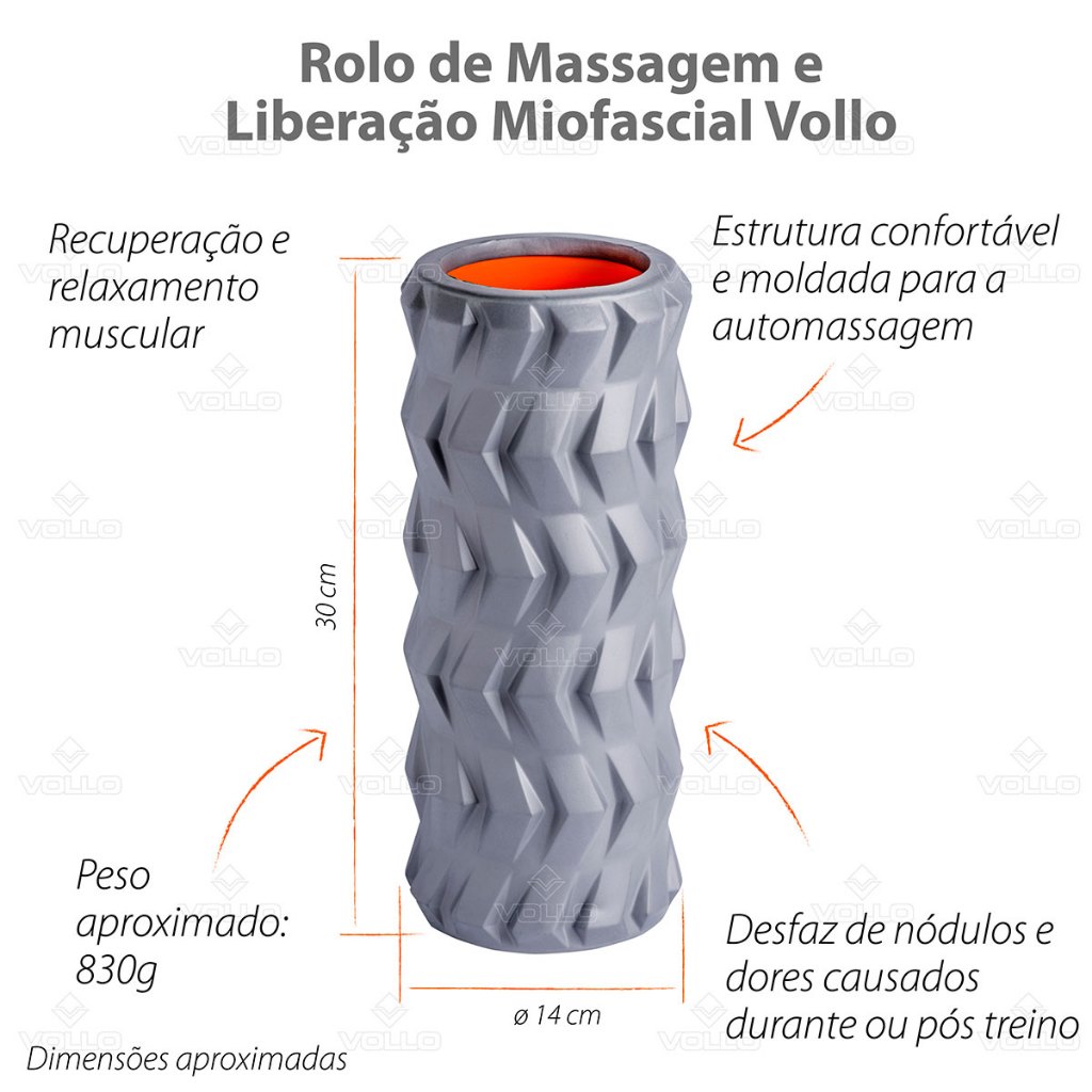 Rolo de Massagem Liberação Miofascial Vollo Tensões musculares, rigidez ou contração de nervos, são os desagradáveis incômodos que podem ocorrer durante ou no pós treino de atletas e amadores. A boa notícia é que esse empecilho pode ser solucionado de forma simples e confortável, sem a necessidade de medicamentos (caso não seja necessário). Por isso o Rolo de Massagem e Liberação Miofascial Vollo, também conhecido como Foam Roller, possui papel terapêutico com finalidade na recuperação muscular, além de beneficiar uma melhor mobilidade da coluna e aumento do fluxo sanguíneo, podendo ser utilizado antes e depois das atividades físicas, como uma técnica de automassagem, conhecida como auto liberação miofascial. Os exercícios específicos de rolamento no rolo de liberação miofascial da Vollo são realizados com a pressão do próprio peso corporal que desfaz os nódulos e tensões presentes no corpo. Dessa forma, o rolo de massagem tende a eliminar os "pontos gatilho", que são como pequenos nós que se desenvolvem na fáscia muscular (tecido conjuntivo que envolve os músculos), tornando os músculos mais facilmente treináveis, mais flexíveis, fortes e resistentes a lesões. Prepare o seu corpo antes e após os treinos com o Rolo de Liberação Miofascial Vollo e garanta muito mais bem-estar e desempenho nos exercícios. Principais Benefícios do Rolo de Liberação Miofascial Vollo • Estrutura confortável e moldada para a automassagem • Recuperação e relaxamento muscular • Aumento do fluxo sanguíneo • Mais mobilidade e flexibilidade • Desfaz de nódulos e dores causados durante ou pós treino • Melhor preparação muscular Especificações Rolo de Liberação Miofascial Vollo • Composição: EVA e PVC • Peso aproximado: 830g • Peso suportado: 100kg • Dimensões aproximadas: 30cm x 14cm x 14cm