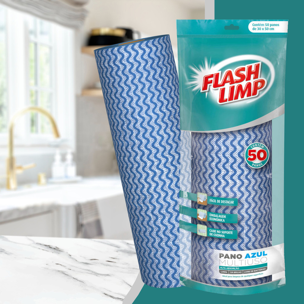 Rolo Pano Multiuso Flash Limp Azul com 50 Panos Lavável