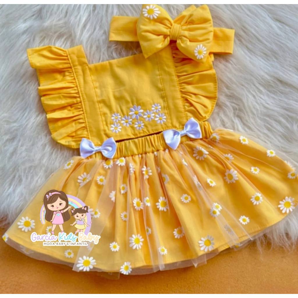 Romper amarelo rosa Margarida. 3 meses a 2 anos