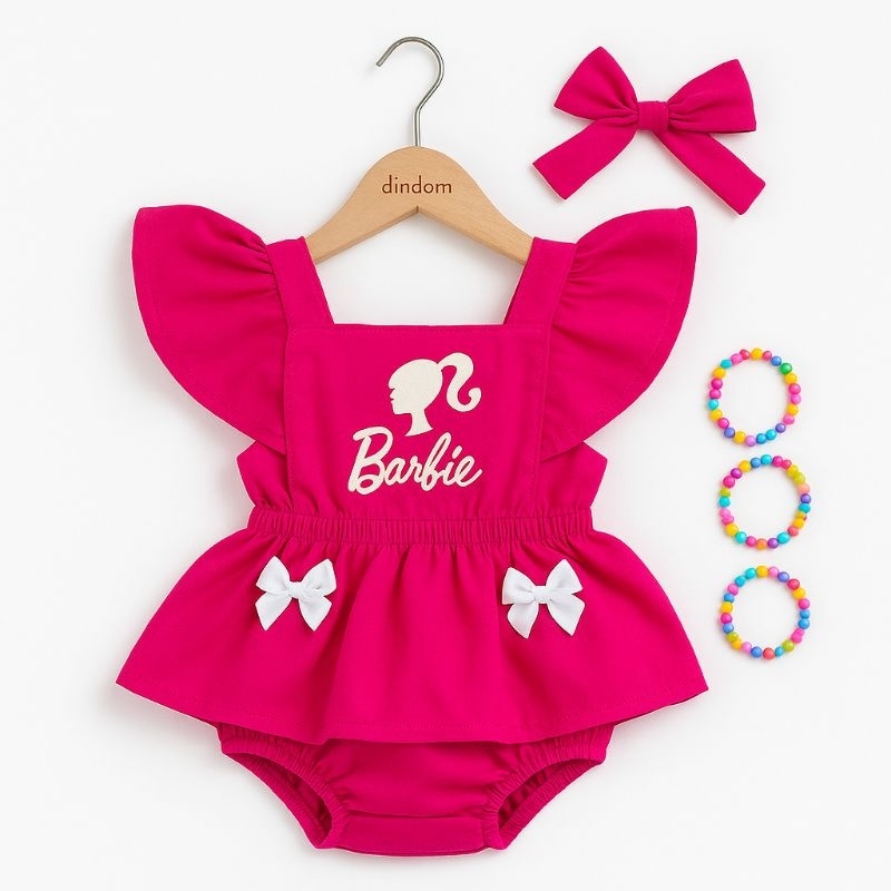 Romper Barbie com Laço e Pulseirinhas mesversário bebê Deixe sua pequena ainda mais linda com esse romper temático da Barbie, um encanto em cada detalhe! Feito em tecido confortável e de alta qualidade, esse modelinho vem no autêntico tom rosa choque Barbie, com bordado frontal exclusivo, dois lacinhos brancas na saia e acessórios que completam o look: laço de cabeça combinando e pulseirinhas de miçangas coloridas – um charme à parte! Acompanha: laço de cabeça + pulseirinhas de miçangas Material: Tecido leve e macio, ideal para o dia a dia Detalhes: Bordado Barbie na frente e lacinhos brancos decorativos Conforto: Elástico na cintura e nas perninhas para melhor ajuste Indicado para: Bebês e meninas pequenas Look completo com acessórios Estilo moderno e delicado Ideal para ensaios, passeios e presentes Medidas Aproximadas P veste de 3 meses M veste de 6 meses G veste de 9 meses