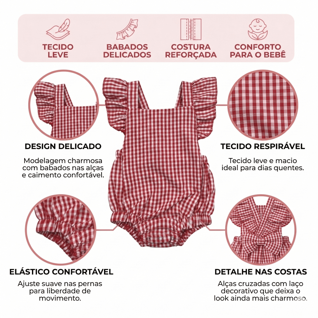 O Romper Bebê Menina Infantil Xadrez Vermelho com Babado e Laço é a escolha perfeita para mães que buscam roupa infantil feminina elegante, confortável e estilosa. Com estampa xadrez clássica em vermelho, detalhes delicados em babado e laço charmoso, o romper cria um look encantador para passeios, fotos e ocasiões especiais. Ideal para bebês que precisam de conforto real sem abrir mão do estilo. 👶 Conforto Premium para a Pele Sensível do Bebê Produzido com tecido macio e respirável, o romper oferece conforto prolongado e liberdade de movimento. Benefícios do tecido: ✔ Toque macio e confortável ✔ Alta respirabilidade ✔ Não irrita a pele ✔ Caimento leve e natural ✔ Ideal para verão e meia-estação ✔ Mantém qualidade após lavagens Pensado para bebês ativos que engatinham e brincam. ❤️ Estampa Xadrez Vermelho Clássica O xadrez vermelho é atemporal e elegante, muito procurado em roupas infantis femininas. Perfeito para: • Passeios em família • Ensaios fotográficos • Festas e aniversários • Datas comemorativas • Uso diário estiloso Visual delicado que chama atenção nos marketplaces. 🎀 Detalhes Delicados com Babado e Laço O romper possui acabamento charmoso que valoriza o look: ✔ Babado delicado nas mangas ou barra ✔ Laço decorativo elegante ✔ Visual feminino sofisticado ✔ Ideal para fotos Detalhes que fazem diferença na percepção de qualidade. ✨ Diferenciais do Romper Bebê Menina ✔ Romper infantil feminino premium ✔ Estampa xadrez vermelha elegante ✔ Babado e laço delicados ✔ Modelagem confortável ✔ Fácil de vestir e trocar ✔ Botões resistentes ✔ Ideal para verão ✔ Excelente custo-benefício Peça essencial no enxoval da bebê. 📏 Modelagem Pensada para Bebês A modelagem segue padrão infantil brasileiro, garantindo ajuste confortável e liberdade de movimento. Características: • Elasticidade confortável • Abertura inferior prática • Não aperta nas perninhas • Costuras reforçadas • Caimento natural 👉 Recomendamos comparar com um romper da criança para escolha ideal e evitar trocas. 🎁 Presente Perfeito para Bebê Menina Excelente opção para: • Chá de bebê • Saída maternidade • Aniversário infantil • Natal • Presente para neta, sobrinha ou afilhada Produto bonito, útil e muito usado no dia a dia.