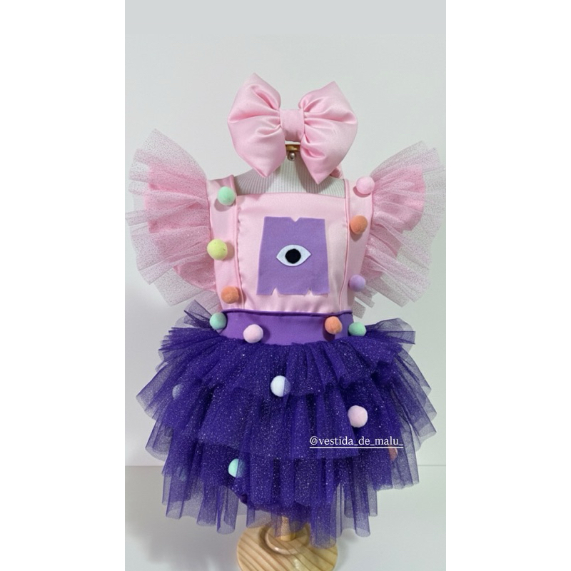 ✨ Romper luxo Monstros S.a ✨ Um charme cheio de personalidade e fofura! 💜 Feito com tecido crepe Amanda na parte superior, trazendo aquele toque sofisticado e macio que amamos! A saia é confeccionada com camadas de tule francês roxo com brilho, garantindo volume e encanto em cada movimento. 💫 Detalhes que fazem toda diferença: 🎀 Babados em tule rosa nos ombros 🎀 Aplicações de pompons coloridos 🎀 Um laço enorme nas costas, super delicado 🎀 Bordado exclusivo no bustinho