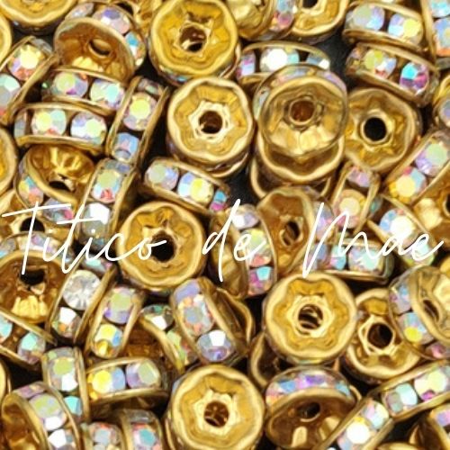 Rondelas de Strass - Produto de Excelente qualidade Cor: Base Prata com cristal branco Base Dourada com cristal furtacor Base Dourada com cristal colorido Base Dourada com cristal branco Base Ródio com cristal branco Tamanhos 6/8 e 10MM Quantidade: 100 Unidades Metal com Strass Sugestão de Uso: Ideal para montagem de pulseiras, terços, colares, chaveiros e tudo que envolve artesanato. Produto a pronta entrega com postagem imediata Observação: As configurações do seu monitor podem interferir na reprodução fiel da cor em sua tela e de acordo com o lote, o produto pode apresentar uma leve variação de cor