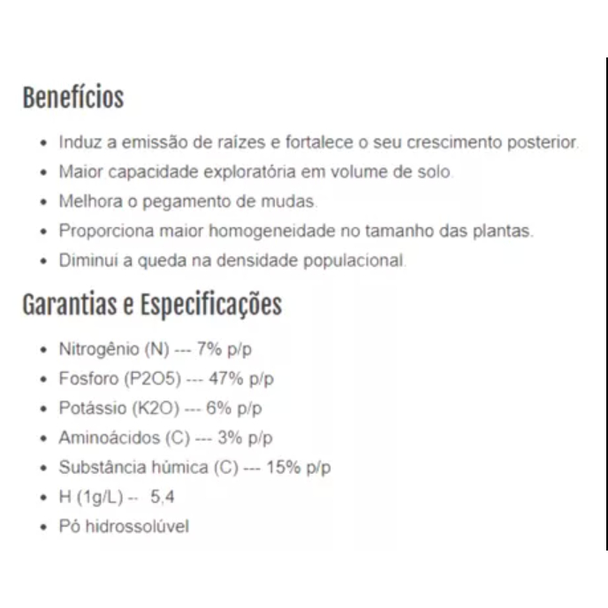 ROOTEX Validade do lote: Junho/2028 Pacote de 50g Descrição: O ROOTEX da Cosmocel é uma combinação de aminoácidos, ácidos orgânicos e nutrientes que induzem a emissão de raízes e fortalecem seu crescimento subsequente. Benefícios Gerais: Maior capacidade exploratória do solo; Melhor formação de tecido vascular; Aumento na síntese de hormônios vegetais; Potencial produtivo elevado. Principais Benefícios: ✅ Favorece a emissão de raízes; ✅ Fortalece o crescimento radicular; ✅ Amplia a exploração do volume do solo; ✅ Melhora o aproveitamento de fertilizantes aplicados; ✅ Acelera a recuperação pós-transplante de mudas; ✅ Proporciona homogeneidade no tamanho das plantas; ✅ Reduz a queda na densidade populacional. Indicações de Uso: Aplicação no solo para culturas anuais e perenes; Compatível com sistemas de irrigação por gravidade e pressurizada; Uso em culturas sob condições temporárias. Recomendações: Nossas orientações são gerais e baseadas em experimentação confiável. Sugerimos ajustes conforme análise de solo e tecido. Modo de Uso: Aplicação Dosagem Rega Sulco (Cereais) 1 a 5 kg Irrigação (HFF) 0,3 a 1 g/m² Sementes (Sólido) 200 a 400 g/100 kg Rega (Mudas) 2 a 4 g por litro de água Hidroponia 0,5 g/L de solução Momento de Aplicação: Pré ou pós-germinação; Pós-transplante; Pré-poda e pós-brotação; Pegamento, frutificação e pós-colheita. Composição: Componente Concentração Nitrogênio (N) 7% Fósforo (P₂O₅) 47% Potássio (K₂O) 6% L-Aminoácidos 3,0% Ácidos húmicos 15,5% Auxinas 0,03% Inertes 21,47% Nota Importante: Consulte um engenheiro agrônomo para adequar o uso às condições específicas da sua lavoura.