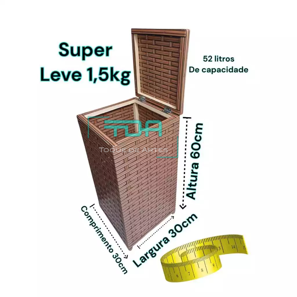 Cesto de Roupas Decorativo – Funcionalidade que Valoriza Seu Espaço Pequenos detalhes fazem toda a diferença na sua casa. O cesto de roupas com estrutura de madeira e acabamento em fibra sintética foi criado para quem quer manter tudo organizado sem comprometer a estética do ambiente. Com visual moderno, elegante e acolhedor, ele se integra perfeitamente à decoração, deixando o espaço mais bonito, limpo e harmonioso. Sua estrutura em madeira garante firmeza e durabilidade, enquanto a fibra sintética oferece um acabamento sofisticado e fácil de cuidar. Ideal para quartos, banheiros, closets ou lavanderias, este cesto transforma uma tarefa simples do dia a dia em uma experiência mais prática e agradável. ✔ Estrutura resistente em madeira ✔ Acabamento em fibra sintética sofisticado ✔ Organiza as roupas com charme e discrição ✔ Item decorativo que valoriza o ambiente ✔ Prático, funcional e versátil ::::::::::::::::::::::::::::::::::::::::::::::::::::::::::::::::MEDIDAS DO PRODUTO::::::::::::::::::::::::::::::::::::::::::::::::::::::::::::::::: Largura: 30cm Comprimento : 30 cm Altura : 60cm Um produto pensado para quem gosta de organização, conforto visual e bom gosto em cada detalhe. Leve agora para sua casa e sinta a diferença de um ambiente mais organizado e elegante !!