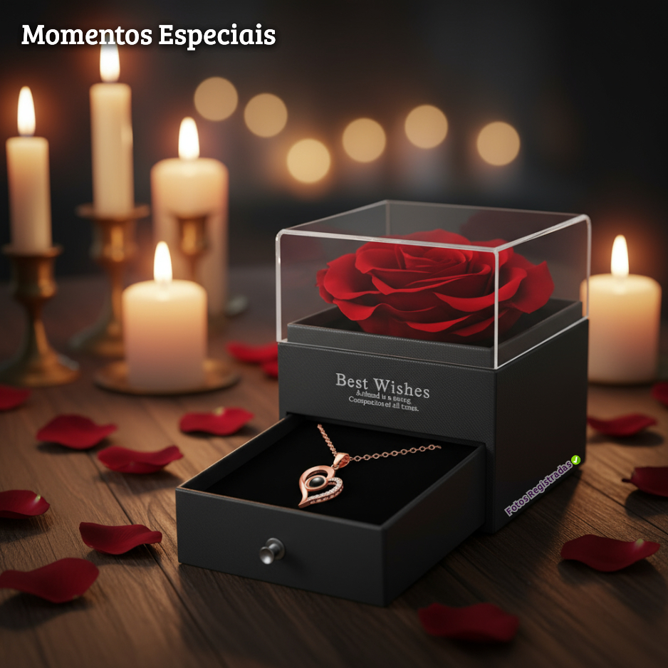 Rosa Eterna c/ Colar Coração — “Eu Te Amo” em 100 Idiomas Caixa Premium em Couro WEBOX