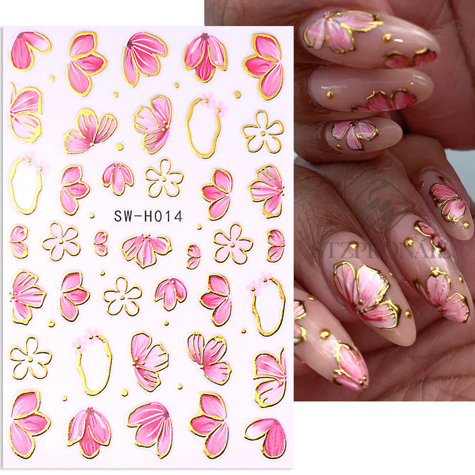 Rosa Hibisco Flor Etiqueta Da Arte Do Prego 3D Ouro Linhas Irregulares Arco Pétala Borboleta Folhas DIY Bronzeamento Y2K