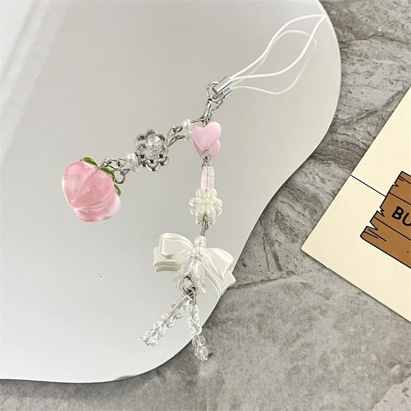 Rosa Kawaii Y2K Pêssego Chaveiro Amor Coração Encantos Do Telefone Bonito Bowknot Grânulo Pingente Doce Menina