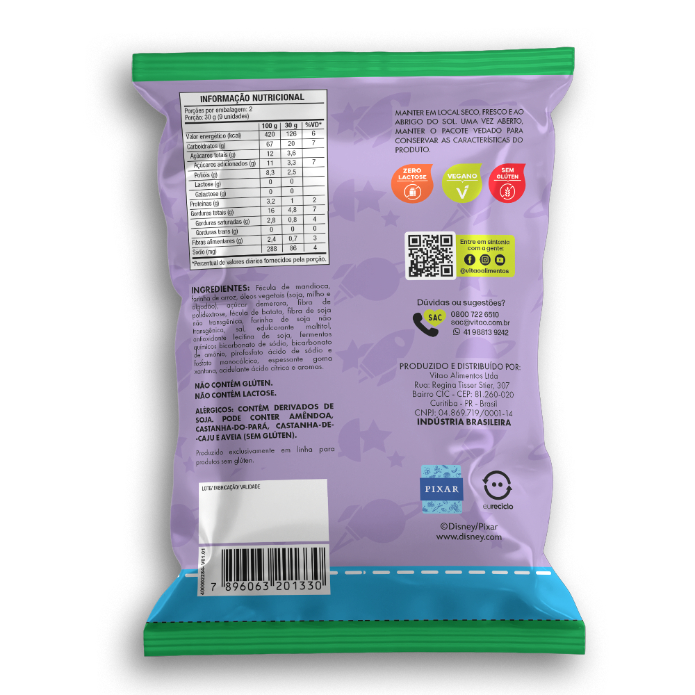 Desfrute de uma experiência única com a Rosquinha Disney sabor Leite, onde o sabor delicado do leite se encontra com uma textura crocante e irresistível. Cada mordida é uma viagem de sabores suaves, trazendo a magia Disney para seus lanches de forma deliciosa. Combine a rosquinha com café ou chá para um lanche da tarde reconfortante. Também pode ser utilizada como base para sobremesas simples, como pavês, ou coberta com geleias para um toque extra de sabor. INGREDIENTES: Fécula de mandioca, farinha de arroz, óleos vegetais (soja, milho e algodão), açúcar demerara, fibra de polidextrose, fécula de batata, fibra de soja não transgênica, farinha de soja não transgênica, sal, edulcorante maltitol, antioxidante lecitina de soja, fermentos químicos bicarbonato de sódio, bicarbonato de amônio, pirofosfato ácido de sódio e fosfato monocálcico, espessante goma xantana, acidulante ácido cítrico e aromas. ALERGÊNICOS: CONTÉM DERIVADOS DE SOJA. PODE CONTER AMÊNDOA, CASTANHA-DO-PARÁ, CASTANHA-DE-CAJU E AVEIA (SEM GLÚTEN). NÃO CONTÉM GLÚTEN. NÃO CONTÉM LACTOSE. SEM GLÚTEN, ZERO LACTOSE, VEGANO.
