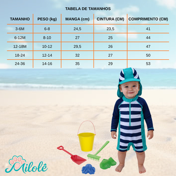 Essa roupinha foi pensada para deixar o bebê livre pra brincar, com conforto e segurança. Zíper frontal com proteção no pescoço: prático na hora de vestir e tirar. Tecido leve, manga longa e proteção UV. E o chapéu? Um carinho a mais para a cabecinha e o pescoço do seu bebê. Porque amar também é proteger. Escolha o melhor para quem você mais ama. Principais características: - Com proteção UV 50+, ideal para dias de sol e calor - Confortável para o bebê, material flexível e macio que se ajusta ao corpo - Fechamento frontal com zíper, com proteção no pescoço, prático de vestir e tirar - Tecido em nylon (80%) com spandex (20%) de excelente qualidade - Tecnologia de secagem do tecido ultra-rápida, rigoroso controle de qualidade