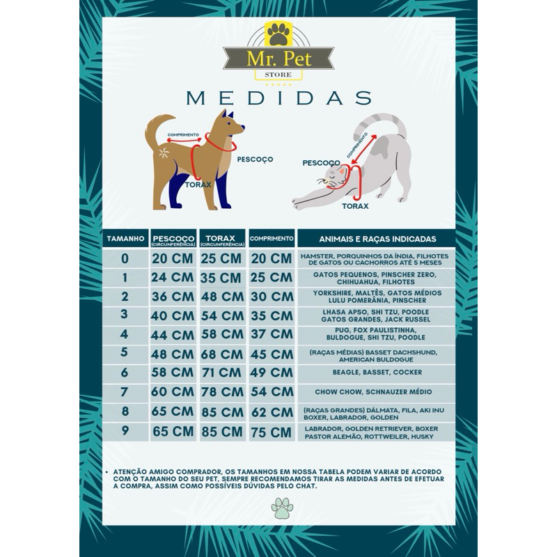 Mr. Pet - Confecção e Estamparia artesanal ---- MEDIR SEU PET ANTES DE EFETUAR A COMPRA ! ---- As melhores roupinhas que seu pet irá ter! Nossas roupas pet são projetadas com alta qualidade e pensadas no conforto do seu animal de estimação. Feitas com materiais duráveis e macios, proporcionam uma sensação agradável ao toque. Além disso, oferecemos uma ampla variedade de tamanhos para atender às necessidades de cães e gatos de diferentes portes. Seja para mantê-los quentinhos no inverno ou protegê-los do sol no verão, nossas roupas proporcionam estilo e bem-estar aos seus companheiros peludos. Essas são as medidas correspondentes a cada tamanho na tabela de roupas para animais de estimação. Lembre-se de sempre tirar as medidas do seu pet antes de efetuar a compra, pois as medidas podem variar de acordo com o tamanho do animal. Tamanho 1: - Comprimento: 20 cm - Pescoço (circunferência): 24 cm - Peito (circunferência): 30 cm Tamanho 2: - Comprimento: 30 cm - Pescoço (circunferência): 36 cm - Peito (circunferência): 48 cm Tamanho 3: - Comprimento: 35 cm - Pescoço (circunferência): 40 cm - Peito (circunferência): 54 cm Tamanho 4: - Comprimento: 37 cm - Pescoço (circunferência): 44 cm - Peito (circunferência): 58 cm Tamanho 5: - Comprimento: 45 cm - Pescoço (circunferência): 48 cm - Peito (circunferência): 68 cm Tamanho 6: - Comprimento: 49 cm - Pescoço (circunferência): 58 cm - Peito (circunferência): 71 cm Tamanho 7: - Comprimento: 54 cm - Pescoço (circunferência): 60 cm - Peito (circunferência): 78 cm Tamanho 8: - Comprimento: 62 cm - Pescoço (circunferência): 65cm - Peito (circunferência): 85 cm Tamanho 9: - Comprimento: 70 cm - Pescoço (circunferência): 70 cm - peito (circunferência): 95 cm SOB MEDIDA: Nosso serviço de confecção de roupas pet sob medida garante que seu amiguinho tenha um ajuste perfeito e confortável. Reconhecemos que cada animal é único, com tamanhos e proporções distintas, e é por isso que oferecemos essa opção personalizada. Ao encomendar uma roupa pet sob medida, você terá a certeza de que o produto será especialmente adaptado às medidas do seu animal de estimação. Nossa equipe de especialistas em moda pet se dedicará a criar uma peça exclusiva, levando em consideração as medidas precisas do seu pet para garantir o máximo conforto e estilo. Além disso, queremos proporcionar uma experiência excepcional aos nossos clientes que optarem por roupas pet sob medida. Portanto, oferecemos prioridade no envio desses produtos. Assim que a roupa estiver pronta, faremos o envio imediato para que seu amiguinho possa desfrutar do novo visual sem demora.