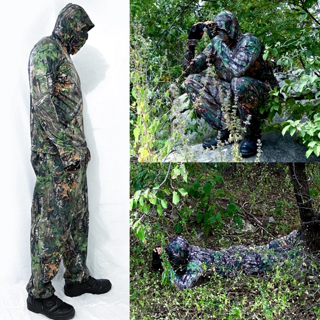 Roupa especial de camuflagem realista. Fique invisível em suas atividades na mata ou terrenos com vegetação. Tamanho Do P ao GG. Ela é ajustável as suas medidas, pois possui elásticos. É leve, respirável e confortável. O kit acompanha: 01 Calça 01 Camisa com capuz 01 Bandana Secagem Ultra Rápida - O suor do corpo é absorvido e levado à superfície para evaporação, mantendo você seco e confortável.