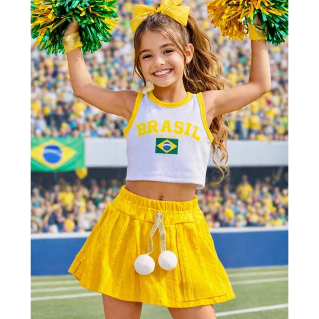 Roupa Conjunto Infantil Brasil Menina Short Saia Confortável Regata Brasil + Shorts Saia Verde/Amarela/Azul | Look Copa