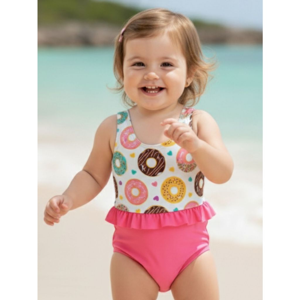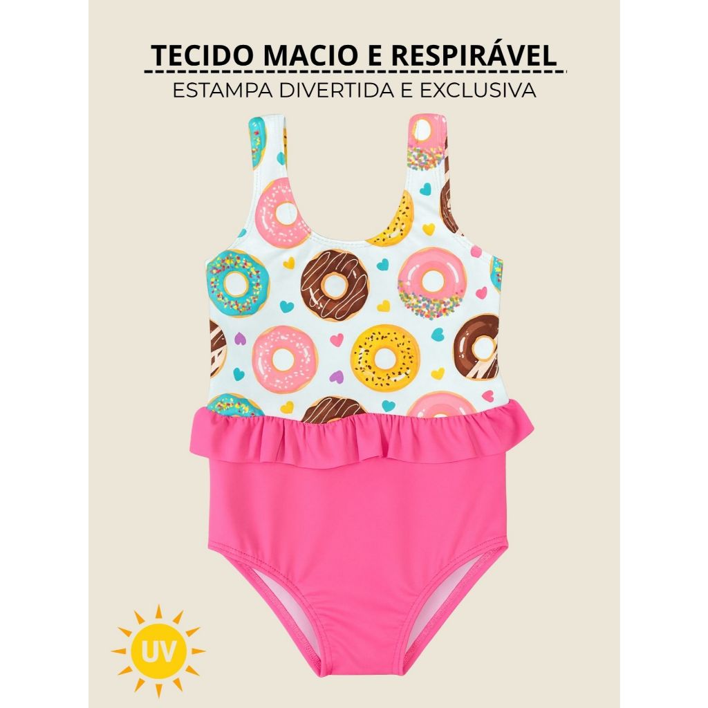 Maiô de praia infantil UV50+ com blusa manga longa e peça de banho (sunga ou calcinha). Leve, confortável, secagem rápida, sem transparência, resistente ao cloro, não desbota e elástico. Ideal para praia, piscina e areia. Tamanhos até 02 anos, estampa de rosquinha, docinhos. Tecido composto em 92% poliéster e 8% elastano com forro 100% poliéster. ESTAMOS COM COLEÇÃO DE PRAIA IMPERDIVEL! CONFIRA PRODUTOS SEMELHANTES EM NOSSA PÁGINA! 📏 TABELA DE MEDIDAS 🩱MAIÔ (cm) Tam | Idade | Comprimen. | Largura 1 | 7 a 12 MESES | 28 CM | 22 CM 2 | 12 a 18 MESES | 34CM | 24 CM 3 | 18 a 24 MESES | 35 CM | 26 CM ⚠️ As medidas podem variar ±1 cm conforme a costura. Indicamos que você compare as medidas da tabela com alguma roupinha que a criança já use. Assim, garantimos um ajuste perfeito! DÚVIDAS FREQUENTES: 1. O tecido esquenta ou incomoda a pele da criança? Não! O tecido é leve, macio e respirável, com toque suave ideal para a pele sensível dos pequenos. A tecnologia UV50+ protege sem esquentar e garante conforto até nos dias mais quentes por sua secagem rápida. 2. O forro interno não deixa a roupa pesada? O forro é leve e elástico, costurado de forma confortável para não apertar nem pesar. Ele garante segurança e evita transparência mesmo quando o tecido está molhado. 3. A proteção solar sai com as lavagens? Não! A proteção UV50+ é incorporada nas fibras do tecido, não é um banho químico. Por isso, mantém a eficácia mesmo após várias lavagens, sem perder a cor nem o toque original.
