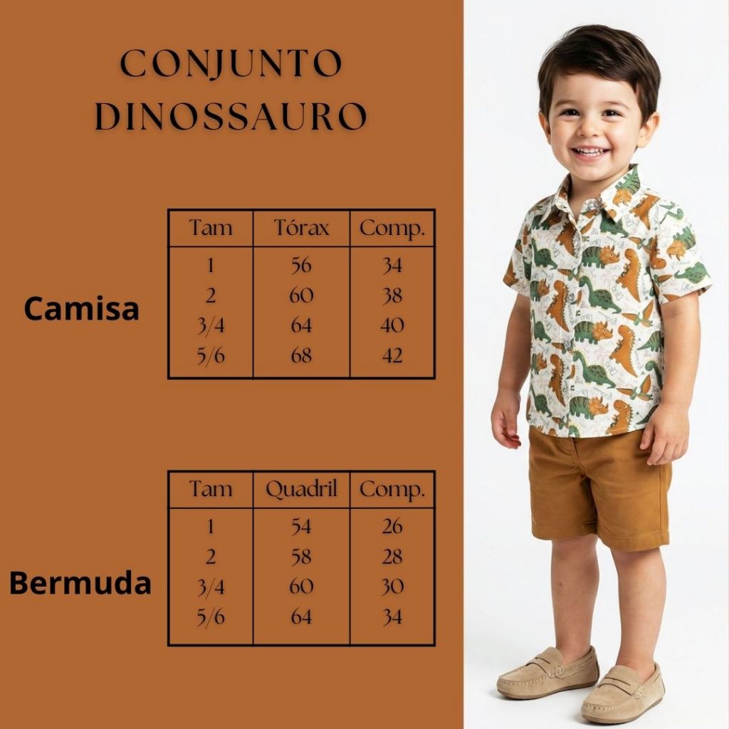 CONJUNTO DINOSSAURO INFANTIL *** Veja o TAMANHO que corresponde ao PESO da criança *** TAM 01 - veste de 08 a 11 Kg TAM 02 - veste de 12 a 15 Kg TAM 03/04 - veste de 16 a 18 Kg - Tecido leve, fresquinho e confortável. - Camisa manga curta com botões na frente. - Bermuda com elástico para regulagem e melhor ajuste a cintura da criança. - Bermuda com bolsos decorativos atrás. Composição: Camisa de Tricoline 65% poliéster e 35% algodão Bermuda de Brim 65% poliéster e 35% algodão