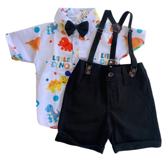 Roupa do DINO BABY infantil conjunto dinossauro bebê menino festa acompanha camisa, gravata, bermuda e suspensório