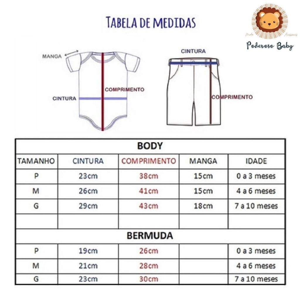 Conjunto Social Poderoso Chefinho ideal para Festa, Aniversário acompanha Camisa social 100%algodão, Bermuda color Preta com elastano e regulagem interna, Suspensório e Gravata, confeccionados em material de alta qualidade, extremamente Confortável. OBS. AO FINALIZAR A COMPRA, INFORMAR QUAL O MODELO DE GRAVATA QUE DESEJA, GRAVATA BORBOLETA OU GRAVATA LINGUÁ. Roupa Aniversário Menino Ideal Festa Tema Poderoso Chefinho Camisa Social Branca M|C 1 ao 16 Bermuda Color Preto 1 ao 16 Kit suspensório e gravata Preto Tamanho Único MEDIDAS: BODY SOCIAL MANGA CURTA Body taman. P - 38cm de comprimento / 23cm de largura na cintura Body taman. M - 41cm de comprimento / 26cm de largura na cintura Body taman. G - 43cm de comprimento / 29cm de largura na cintura Medidas Camisa: Camisa tam 1 - 42cm de comprimento / 26cm de largura Camisa tam 2 - 45cm de comprimento / 28 cm de largura Camisa tam 3 - 48cm de comprimento / 30cm de largura Camisa tam 4 - 49cm de comprimento / 33cm de largura Camisa tam 6 - 51cm de comprimento / 35cm de largura Camisa tam 8 - 55cm de comprimento / 38cm de largura Camisa tam 10 - 58cm de comprimento / 39cm de largura Camisa tam 12 - 60cm de comprimento / 41cm de largura Camisa tam 14 - 64cm de comprimento / 43cm de largura Camisa tam 16 - 68cm de comprimento / 45cm de largura Bermudas: Tamanho (P) Comprimento 23cm / Cintura 19,5cm Tamanho (M) Comprimento 25,5cm / Cintura 21cm Tamanho (G) Comprimento 27,5cm / Cintura 22,5cm Tamanho (01) Comprimento 28cm / Cintura 22cm Tamanho (02) Comprimento 31cm / Cintura 25cm Tamanho (03) Comprimento 33cm / Cintura 26 cm Tamanho (04) Comprimento 38cm / Cintura 27cm Tamanho (06) Comprimento 41cm / Cintura 30cm Tamanho (08) Comprimento 42cm / Cintura 33cm Tamanho (10) - Comprimento 46cm / Cintura 34cm Tamanho (12) - Comprimento 49cm / Cintura 35cm Tamanho (14) - Comprimento 50cm / Cintura 36cm Tamanho (16) - Comprimento 52cm / Cintura 38cm * As medidas indicadas no guia de tamanhos referem-se às medidas da peça, e não do corpo. * Lembramos que este guia é somente referência com medidas aproximadas, uma vez que cada marca tem seu própria medida. Aguardo sua compra. Atenciosamente, Poderoso Baby Moda Acessórios