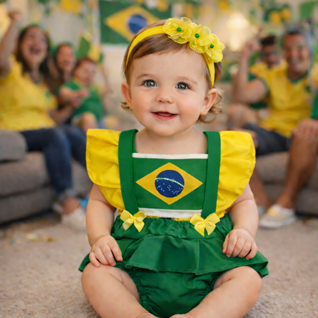 Roupa Infantil Bebê Brasil Verde e Amarelo | Jardineira Torcida Copa + Faixinha Laço