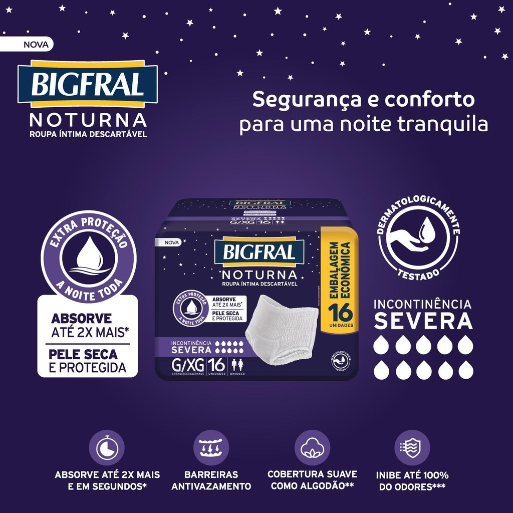 A nova roupa íntima Bigfral Noturna possui sistema de proteção total da pele, é dermatologicamente testada, absorve até 2x mais para que a pele não fique úmida deixando-a mais seca e protegida e possui toque fresco e macio. Indicada para homens e mulheres com incontinência urinária severa. Veste como sua roupa íntima habitual e garante todo conforto e segurança para manter sua rotina.