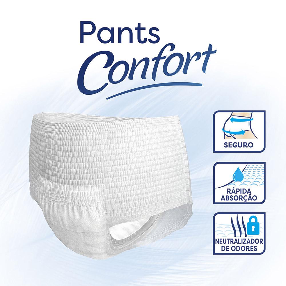 Roupa Íntima Descartável TENA Pants Confort é uma roupa íntima descartável e unissex de rápida absorção, proporcionando ao usuário ativo ou com pouca mobilidade facilidade de uso, discrição e segurança. É indicado para perdas de urina moderada a severa. Núcleo de Ultra Absorção Acquidry; Odour Neutralizer - Sistema que neutraliza o risco de odores indesejáveis; Material Macio - suave ao contato com a pele; Mais elásticos em volta da cintura permitindo uma adaptação perfeita ao corpo; Elásticos duplos nas pernas para um melhor conforto e segurança contra vazamentos; Costuras laterais removíveis para retirar o produto com maior facilidade.