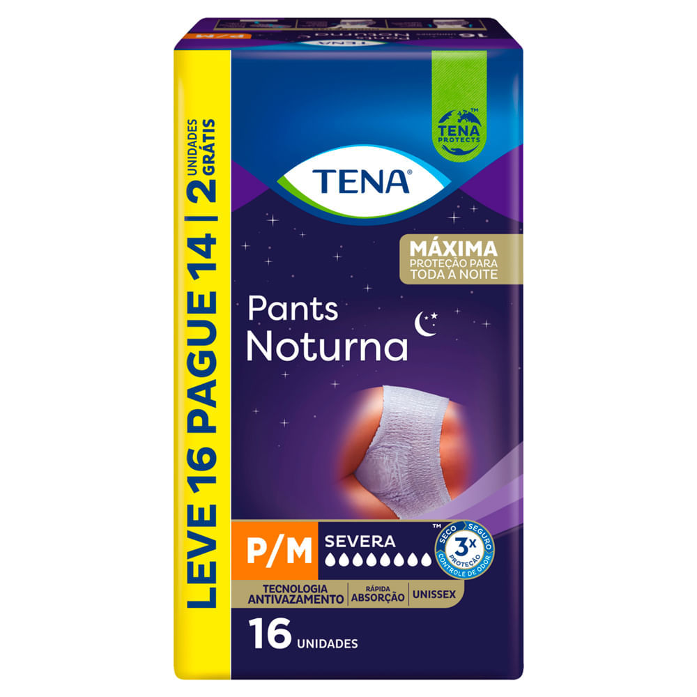 Roupa Intima Tena Pants Noturna Tamanho P/M TENA Pants Noturna é uma roupa íntima descartável e unissex de rápida absorção, proporcionando ao usuário máxima proteção durante toda a noite. É indicado p