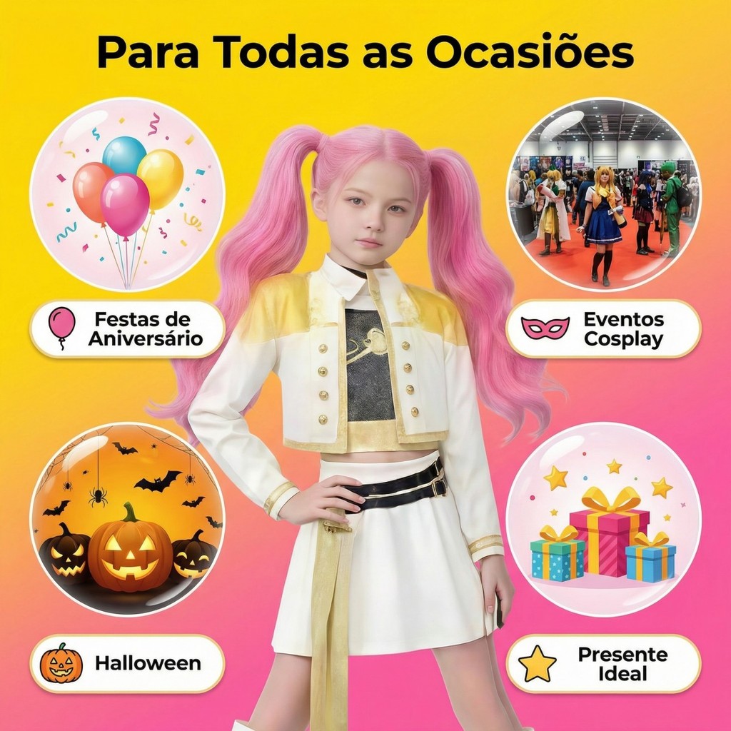 Fantasia K-POP Caça Demônios Menina/Look Rumi Mira Zoey para Festa e Palco Escolar Fantasia Cosplay Anime Caça Demônios | Conjunto K-Pop Ídolo Caçadora – Zoey, Mira, Rumi – Look Palco com Lantejoulas e Estampa ---------------------------------------------------------------------------------------------------------------------------- ATENÇÃO: Este kit não inclui peruca nem calçados.!!!!!!! ATENÇÃO: Este kit não inclui peruca nem calçados.!!!!!!! ATENÇÃO: Este kit não inclui peruca nem calçados.!!!!!!! ----------------------------------------------------------------------------------------------------------------------------- Incluso: Coletes + Jaqueta + Saia.(ATENÇÃO: Este kit não inclui peruca nem calçados.) Material: Poliéster e elastano de alta qualidade, garantindo conforto e durabilidade. Design: Inspirado nos visuais de palco do grupo K-Pop Caçadoras de Demônios, presente em filmes de anime. O estilo K-Pop e a estampa realista farão sua criança brilhar e se destacar. Características: Jaqueta: manga longa, aberta; Cropped: sem manga; Saia: modelo evasê, cintura alta. Ideal para: festas temáticas, cosplay, Halloween, confraternizações, apresentações de palco, ensaios fotográficos, eventos temáticos de cinema, shows de K-Pop, convenções de anime e muito mais. Presente surpresa perfeito para fãs e amantes do estilo K-Pop. Opções de tamanho: Disponível em 4 tamanhos diferentes. Variação de 1 a 3 cm (medição manual). Pequenas variações de cor podem ocorrer devido à calibração do monitor, câmera ou iluminação no momento da foto. Tamanhos (Depende da criança) P/ 110 a 120cm (3 a 4 Anos) M/ 120 a 130cm (5 a 6 Anos) G(L)/ 130 a 140cm (7 a 8 Anos) GG (XL)/ 140 a 150cm (9 a 10 Anos)