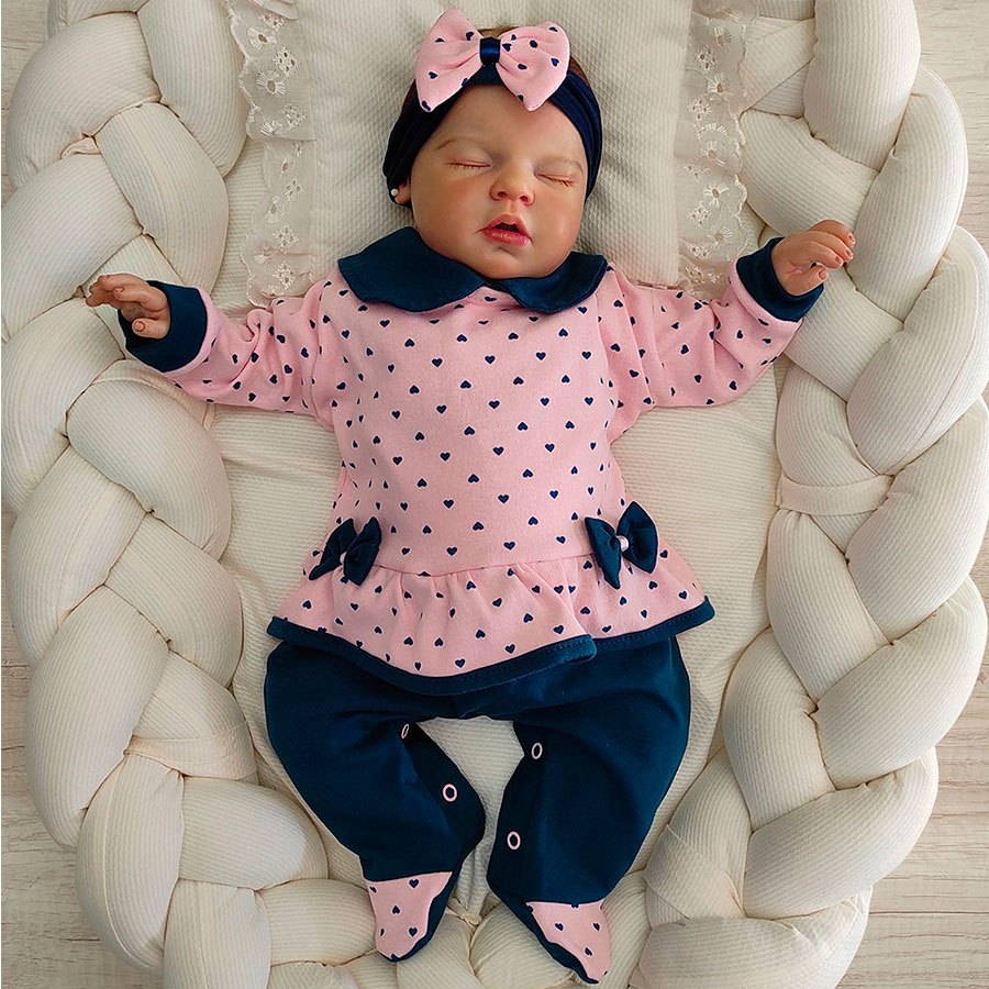 Roupa Menina Macacão Manga Longa Para Bebê com Lacinhos Laura Rosê/Marinho - Tamanho RN, P e M
