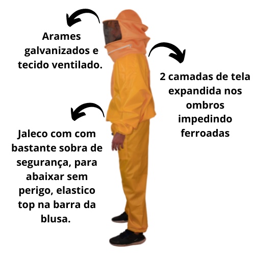 Apiários Itamel (Desde 2007) Roupa para apicultura em 2 partes sendo a calça separada da blusa, feita em nylon 210 nas cores amarelo e branco, viseira resistente com boa visibilidade, não rasga fácil em galhos ou arames, não trinca com tempo, não queima com folige. Elásticos reforçados nas extremidades de alta durabilidade, costura dupla com reforço nas partes que exigem mais , só usamos aviamentos (linhas e láticos) top de linha, roupa bem larga para evitar o contato do ferrão com a pele. Ventilação no peito e nas costas com malha livre dupla camada, ventila e protege de ferroadas, ombros e joelhos também revestidos com tecido anti ferroadas. Para lavar o material colocar de molho em uma bacia por um dia, colocar cloro se for branco e venish ou sabão no amarelo, esfregar as partes sujas com mão e pendurar. . Indico usar uma camisa de algodão por baixo e nossa luva com punho anti ferroadas. . Não gruda ferrão de abelha provocando a morte das campeiras e atraindo ainda mais abelhas. . . Não acompanha bota nem luva . Fazemos sob medida. Fico a disposição ! Akauã do Amaral Procópio Pereira .